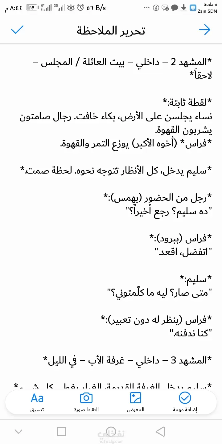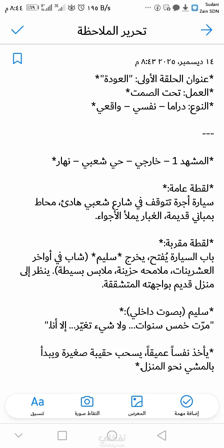 هذا السناريو قمت بكتابته مع الAi الملخص العام: شاب في أواخر العشرينات يُدعى *سليم* يعود إلى منزل عائلته في حي شعبي بعد سنوات من الانقطاع، لحضور جنازة والده. الغريب أن والده مات في ظروف غامضة، في حين أن العائلة تُخفي أسرارًا قديمة. تبدأ رحلة اكتشاف ماضي العائلة، وخصوصًا علاقته بأخيه الأكبر *فراس*، الذي أصبح شخصًا غريبًا تمامًا عن ما كان يعرفه. سليم يبدأ بالشك أن والده لم يمت ميتة طبيعية، وأن العائلة كلها كانت تعلم أمورًا أخفيت عنه لسنوات، خاصة أمه، التي أصبحت صامتة منذ الحادثة… *صمتها يخفي كل شيء.*