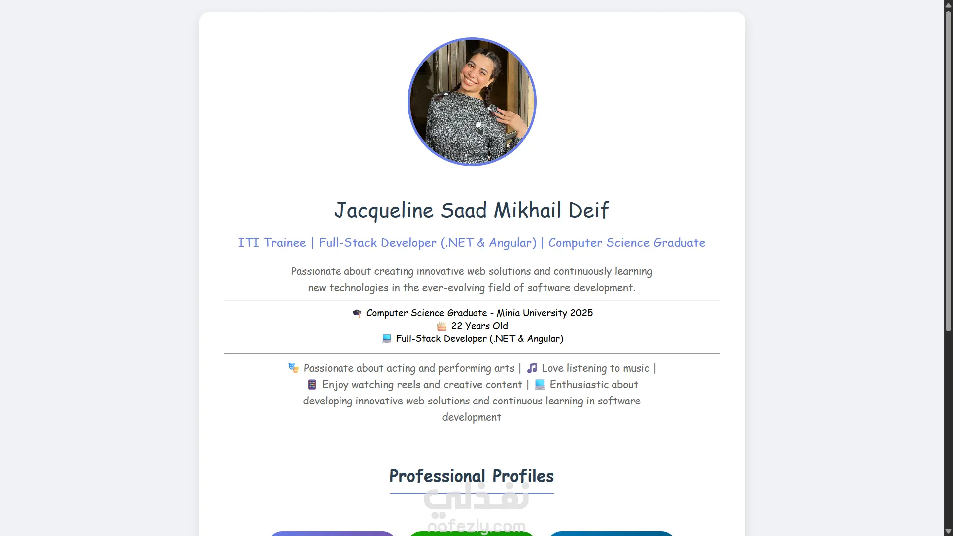 صفحة هبوط بروفايل تحتوي ع صورة شخصية و نبذة عن الشخص ومهاراته و خبراته ف اكتر من مجال معين او اي حاجة حابب يضيفه عن شخصيته او هوايته هيتم تقسيمها ف اقسام وكمان وسائل التواصل بتاعته و لينكات الشغل وغيرها