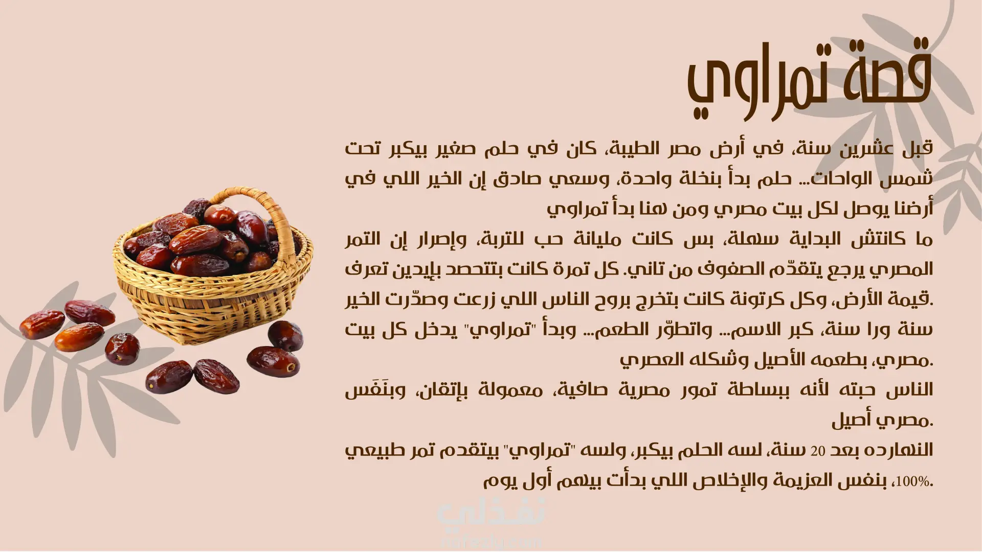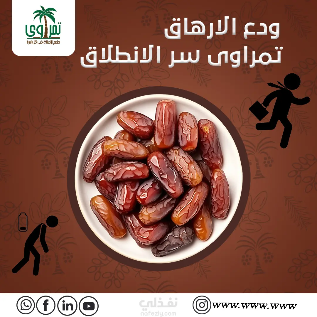 1) الدراسة الإستراتيجية وتحديد الهويةتحليل هوية "تمرواي" البصرية (الاسم الذي يوحي بالطريق أو الوصول)، وتحديد الألوان التي تعكس الطاقة والجودة.تحديد شرائح الجمهور المستهدف: (الرياضيين، الموظفين الذين يبحثون عن وجبات خفيفة صحية، الأسر التي تهتم بالتغذية).تحديد الرسالة التسويقية الرئيسية: "تمرواي: مصدرك اليومي للطاقة والجودة. تذوق الفرق."