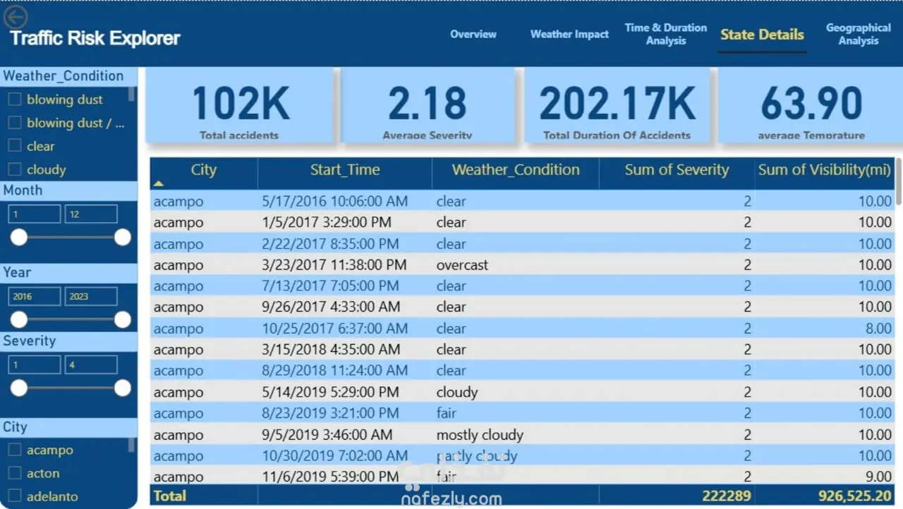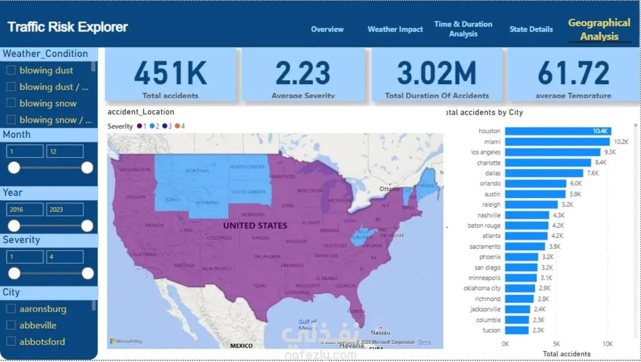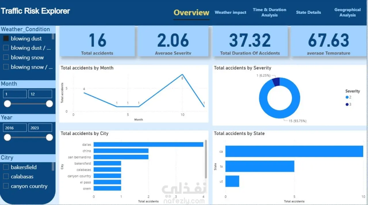 هل ترغب في فهم أسباب حوادث الطرق بشكل أعمق واتخاذ قرارات مبنية على بيانات حقيقية؟ في هذه الخدمة سأقوم بتحليل بيانات حوادث الطرق باستخدام Python وSQL وPower BI لاستخراج رؤى تساعد في تحسين السلامة المرورية واتخاذ قرارات مدروسة. خلال المشروع، أقوم بـ: -دمج وتنظيف البيانات من ملفات متعددة -معالجة التكرارات والقيم المفقودة -تحليل البيانات واستخراج مؤشرات هامة مثل: -أكثر الأوقات التي تزيد فيها الحوادث. -تأثير حالة الطقس (المطر – الضباب – الحرارة). -توزيع الحوادث حسب المدن والمناطق. -مقارنة الحوادث بين النهار والليل. إنشاء Dashboard تفاعلي يعرض النتائج في صفحات متعددة مثل: -نظرة عامة على عدد الحوادث والإصابات والوفيات. - تحليل تأثير الطقس على معدل الحوادث. -تحليل أوقات الذروة للحوادث - تفاصيل الحوادث لكل مدينة. -خريطة تفاعلية تُظهر المناطق الأكثر عرضة للحوادث.