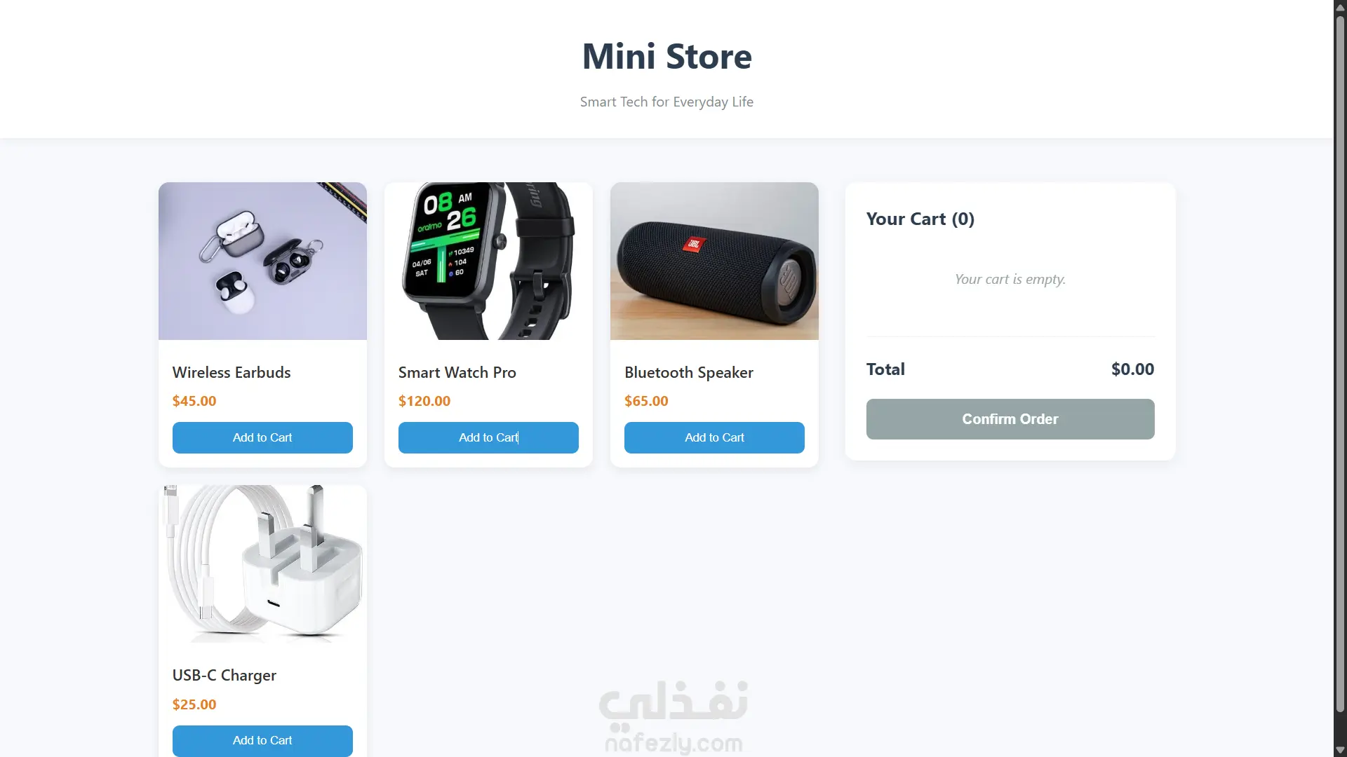 موقع تجارة إلكترونية لمنتجات التكنولوجيا الذكية بتصميم حديث وسهل الاستخدام، يركز على وضوح عرض المنتجات وسهولة التنقل وتجربة شراء مريحة.
