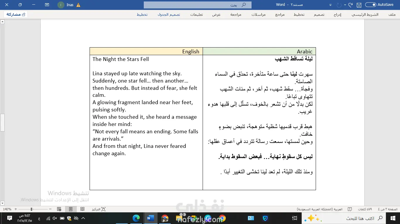 قمت بترجمة قصة قصيرة للأطفال بعنوان ليلة تساقط الشهب مراعية القواعد الأدبية في سرد القصة للأطفال . كانت الترجمة من اللغة الإنجليزية للغة العربية.