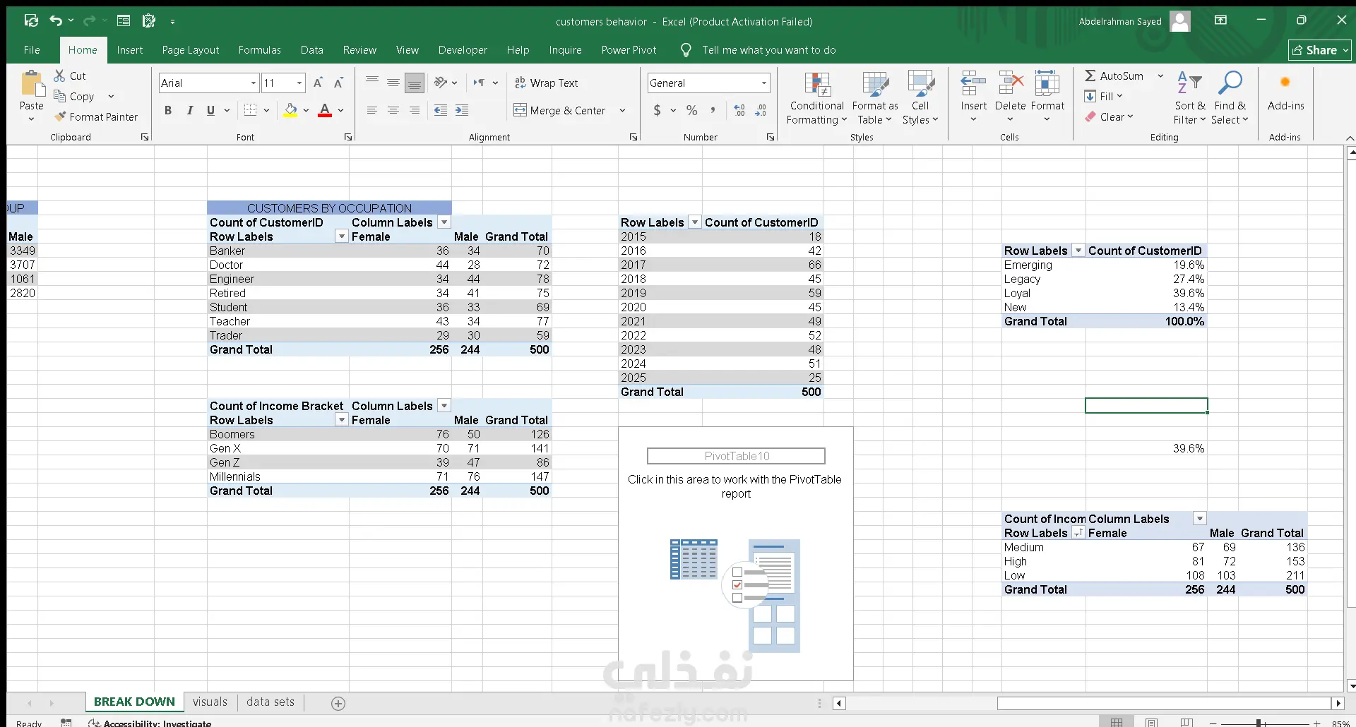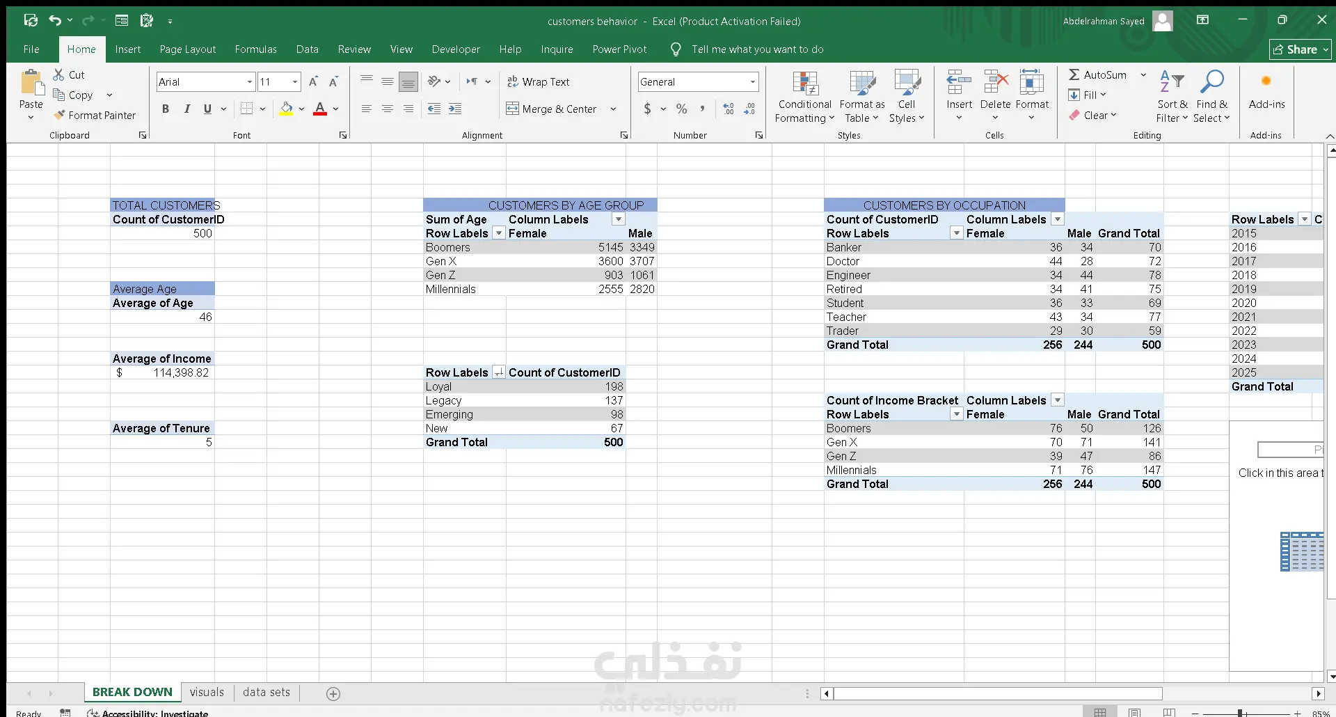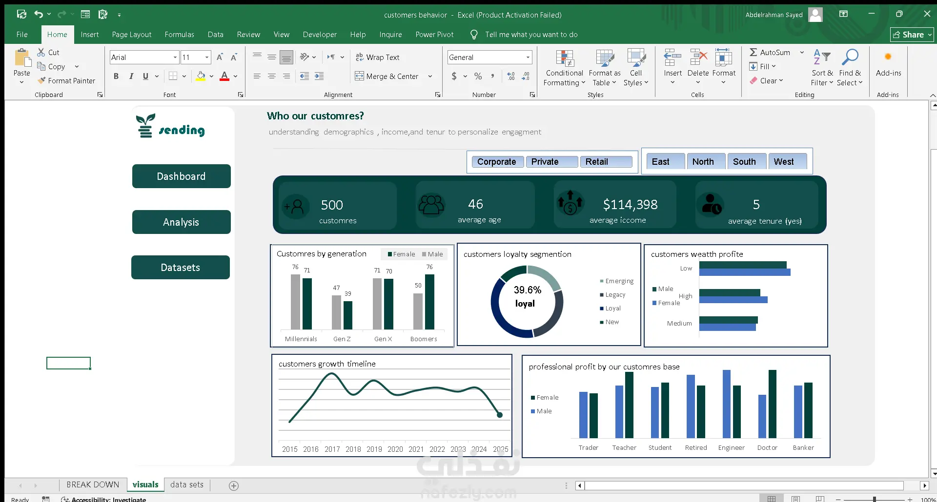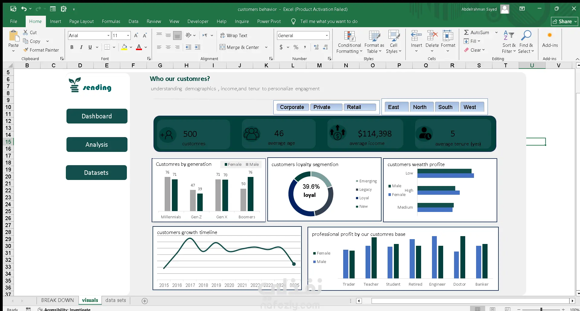 أقدّم لوحة تحكم تفاعلية احترافية داخل Excel تعتمد على Power Query وPower Pivot لعرض وتحليل بيانات *تقسيم العملاء (Customer Segmentation)* بطريقة دقيقة وواضحة، حيث تتضمن مؤشرات رئيسية مثل عدد العملاء ومتوسط العمر والدخل والمدة، مع تحليل متقدم لتوزيع العملاء حسب الأجيال ومستويات الولاء والثروة والوظائف، إضافة إلى مخطط نمو العملاء عبر السنوات وإمكانية التصفية حسب القطاع والمنطقة، وكل ذلك داخل تصميم منظم وسهل الاستخدام يمكن تخصيصه بالكامل وفق احتياجات العميل، مما يجعل الداشبورد أداة فعّالة لاتخاذ قرارات استراتيجية مبنية على البيانات.