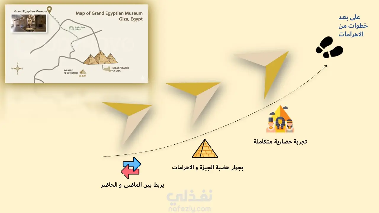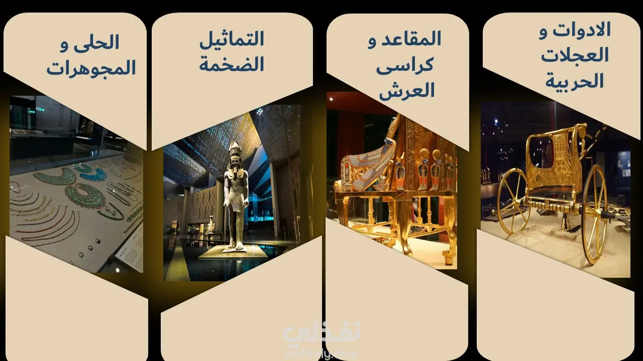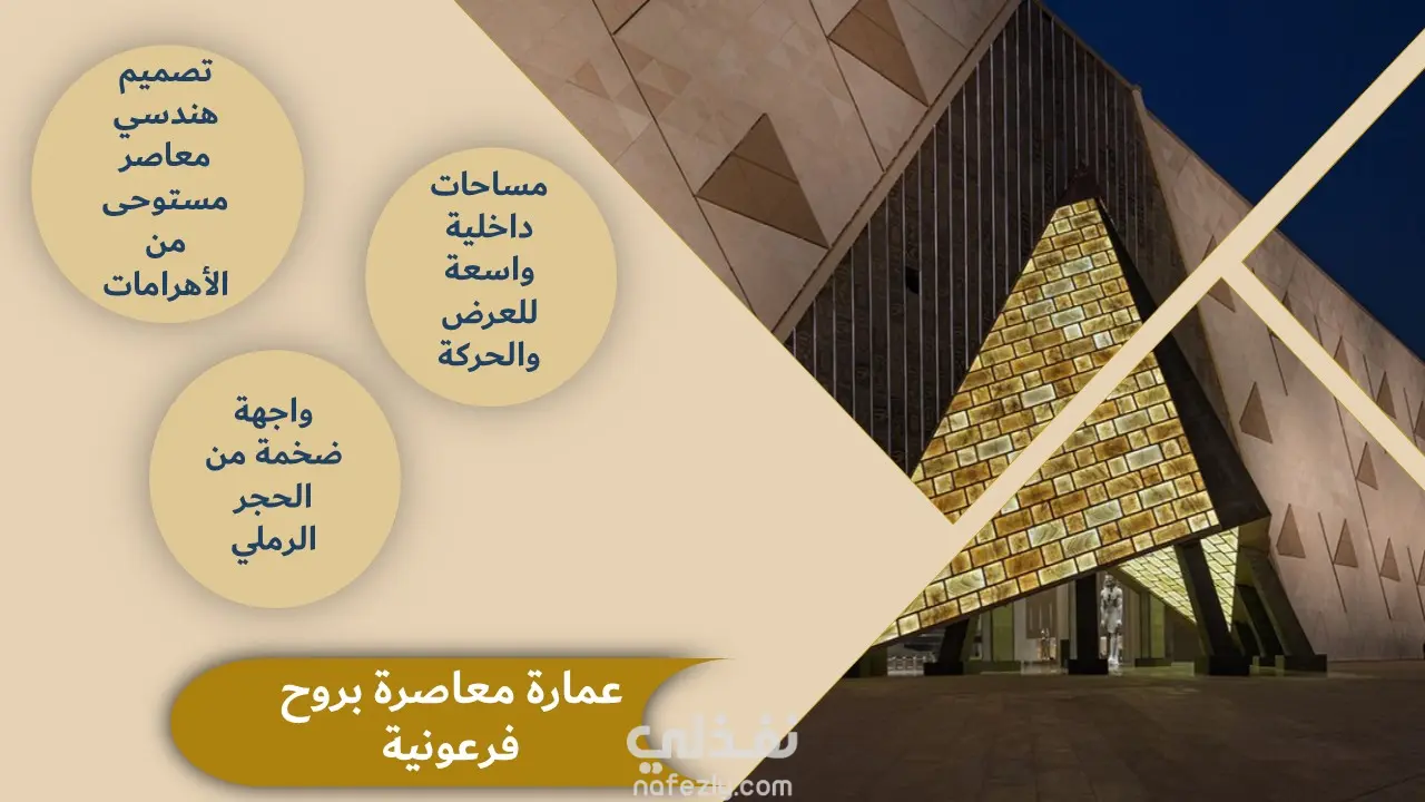 تم تصميم عرض PowerPoint احترافي عن المتحف المصري الكبير بأسلوب فاخر وراقي يبرز قيمة المكان الحضارية والمعمارية، مع التركيز على تجربة الزائر وعرض كنوز الملك توت عنخ آمون بشكل جذاب ومنظم.