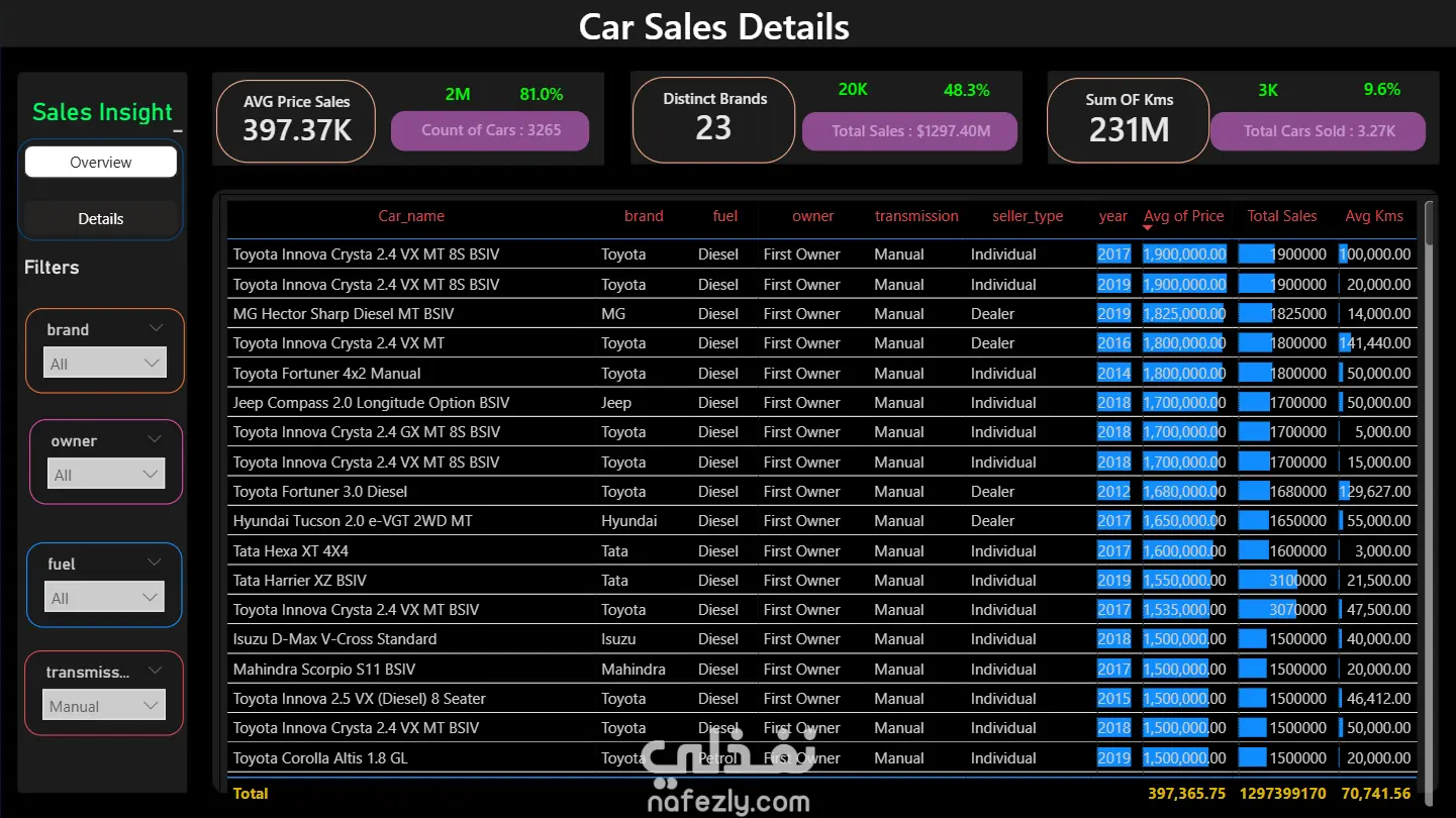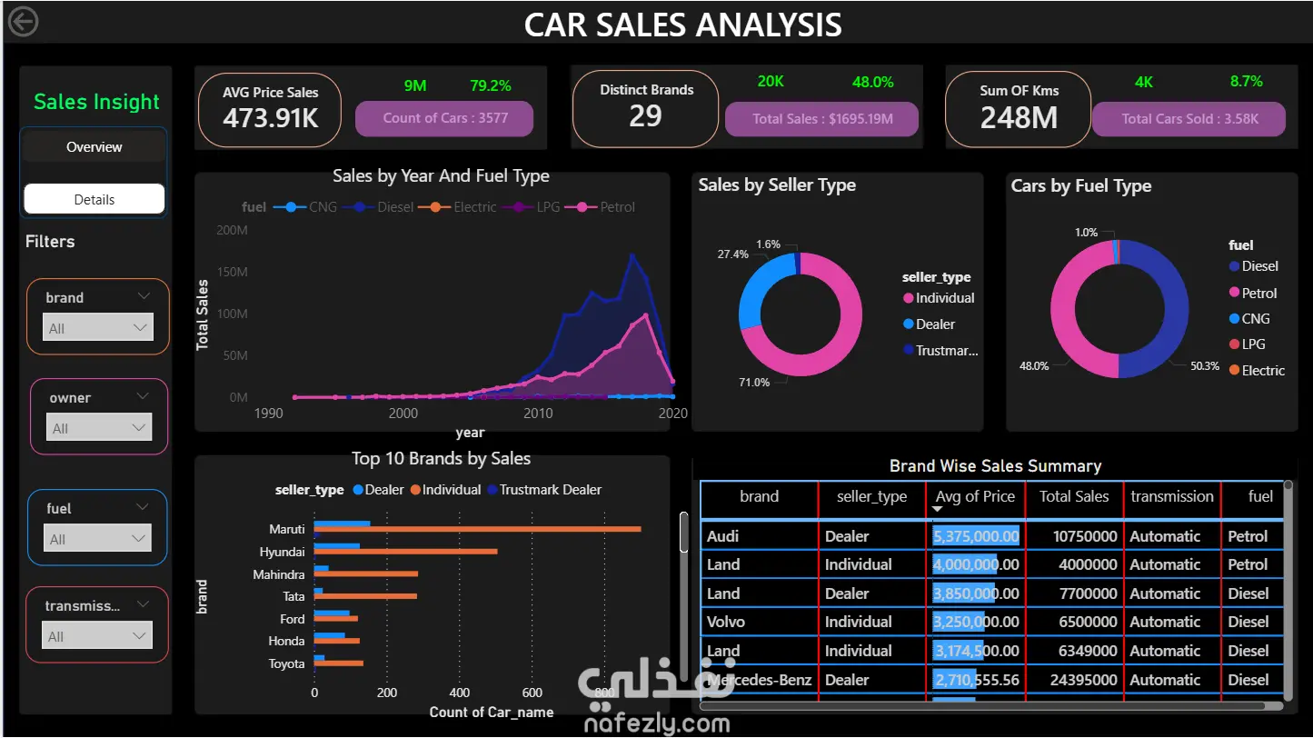 An interactive, KPI‑driven Car Sales Analysis dashboard that visually summarizes overall performance and helps stakeholders make data‑driven decisions. The report combines key metrics such as average selling price, total sales, number of distinct brands, and total mileage with dynamic filters for brand, owner, fuel type, and transmission to enable focused analysis. Using a mix of line, bar, and donut charts, it highlights sales trends by year and fuel type, compares seller types, ranks top‑selling brands, and provides a detailed table of brand‑wise sales, making the design both professional and visually engaging for business presentations.