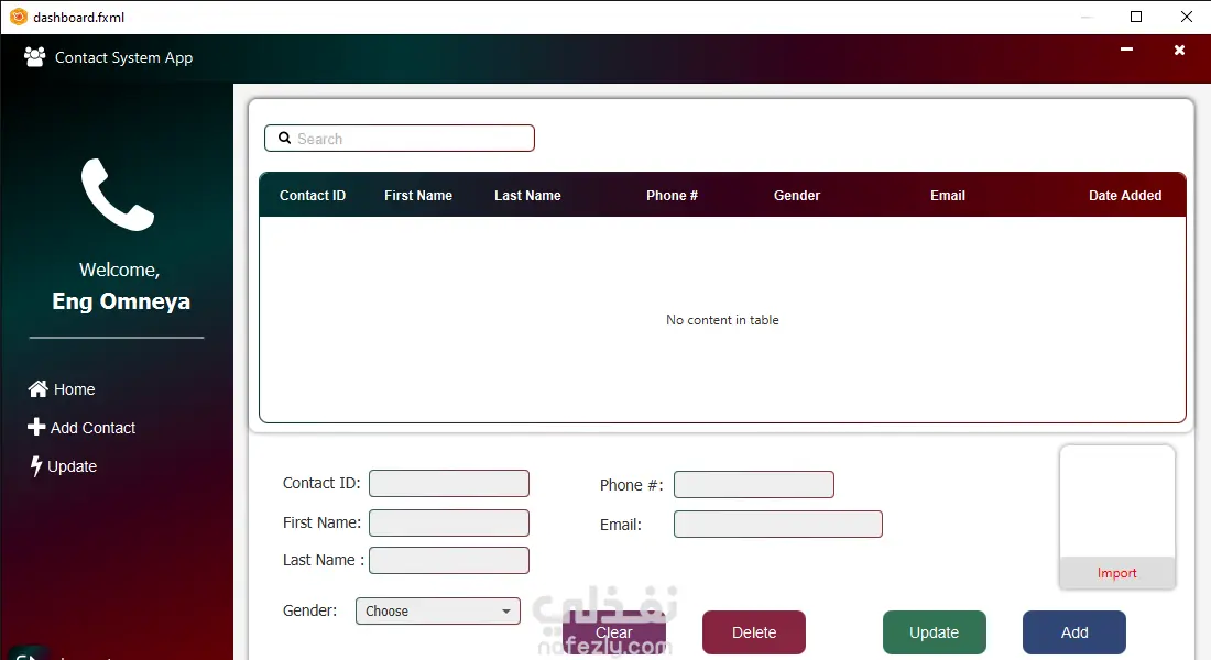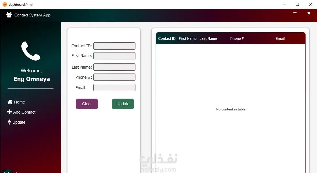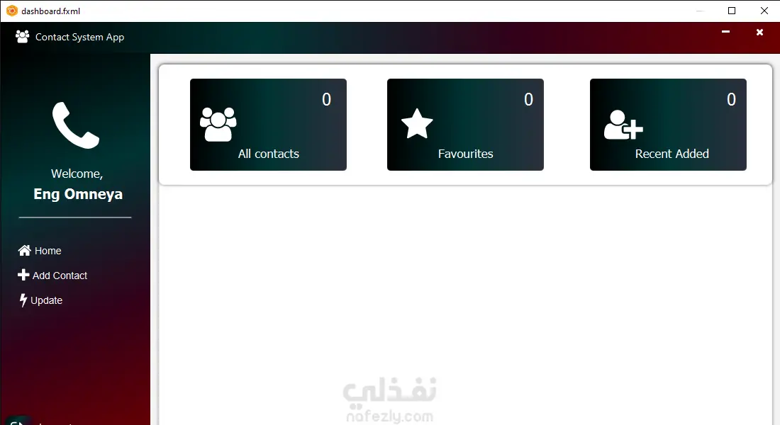 تطبيق إدارة جهات الاتصال الوصف تطبيق إدارة جهات الاتصال هو تطبيق سطح مكتب مبني باستخدام JavaFX، مصمم لإدارة جهات الاتصال الشخصية والمهنية. يتميز التطبيق بواجهة مستخدم سهلة الاستخدام ويشمل الميزات التالية: تسجيل الدخول والخروج للمستخدمين (Authentication) إدارة جهات الاتصال (إضافة، تعديل، حذف) وظيفة البحث عن جهات الاتصال لوحة معلومات تعرض إحصاءات جهات الاتصال استيراد الصور لجهات الاتصال يستخدم التطبيق قاعدة بيانات MySQL ويتميز بواجهة حديثة مع خلفيات متدرجة وإمكانية تحريك نافذة التطبيق بالسحب والإفلات. ملاحظة: بعض وظائف الأزرار (مثل عمليات التعديل) غير مكتملة حاليًا وسيتم تحسينها في التحديثات المستقبلية. التقنيات المستخدمة JavaFX – مكونات واجهة المستخدم MySQL – قاعدة البيانات CSS – تنسيق وتصميم الواجهة FontAwesome – الأيقونات المميزات نظام تسجيل دخول آمن إضافة وحذف جهات الاتصال البحث عن جهات الاتصال لوحة معلومات تفاعلية رفع الصور لجهات الاتصال قيد التطوير وظيفة التعديل الكاملة تحسين فلاتر البحث ميزة النسخ الاحتياطي والاستعادة