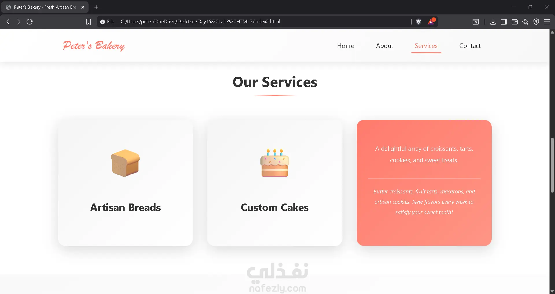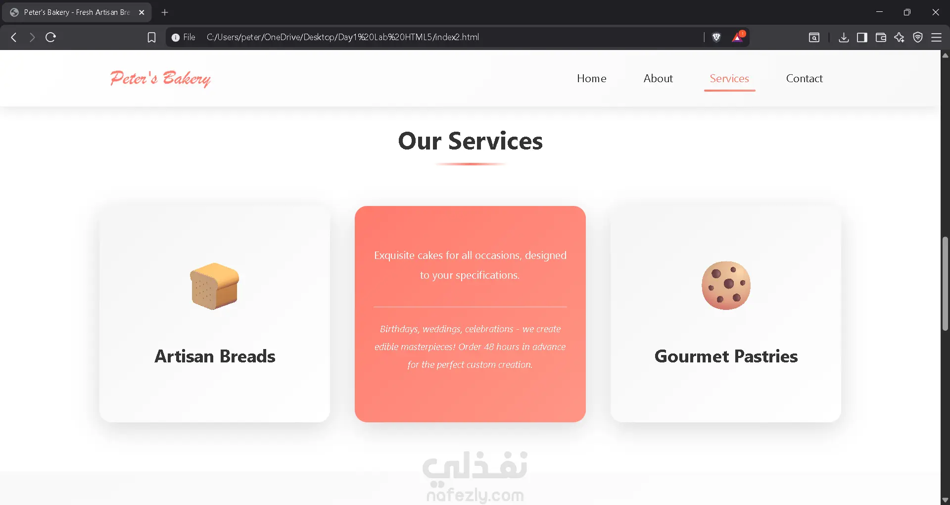 تم تصميم وتطوير صفحة هبوط (Landing Page) عصرية لمخبز حرفي، تهدف إلى جذب العملاء وعرض المنتجات المخبوزة بطريقة شهية وجذابة. يركز التصميم على خلق تجربة مستخدم (UX) دافئة ومرحبّة تعكس هوية المخبز وجودة منتجاته، مع واجهة مستخدم (UI) نظيفة وسهلة التصفح. أقسام الصفحة بالتفصيل: القسم الرئيسي (Home / Hero Section): - يتميز بصورة خلفية عالية الجودة وعريضة تظهر أجواء المخبز الداخلية، مما يعطي انطباعاً فورياً بالترحيب والدفء. - يحتوي على عنوان رئيسي بارز "Welcome to Peter's Bakery" وشعار المخبز. - يتضمن زر دعوة لاتخاذ إجراء (CTA) بلون برتقالي/مرجاني مميز ("Discover Our Delights") لتشجيع الزوار على استكشاف المنتجات. - شريط تنقل (Navigation Bar) علوي بسيط وسلس يسهل الوصول لكافة أقسام الصفحة. قسم "من نحن" (About Us): - يعتمد أسلوب السرد القصصي (Storytelling) لتعريف الزوار بتاريخ المخبز وشغف الخباز. - تنسيق متوازن يجمع بين صورة معبرة للخباز أمام الفرن الحجري ونص تعريفي، مما يعزز الثقة والمصداقية (Human Touch). قسم خدماتنا (Our Services): - عرض الخدمات في تصميم شبكي (Grid Layout) مكون من ثلاث بطاقات ملونة. - تتميز البطاقات بلون موحد (اللون المرجاني المميز للهوية البصرية) لعرض أنواع المخبوزات والخدمات المقدمة (مثل المعجنات اليومية، كعك المناسبات، إلخ). قسم التواصل (Contact Us): تصميم عملي مقسم إلى جزأين: - الجانب الأيسر: نموذج إرسال رسائل (Form) بسيط يشمل البريد الإلكتروني، الموضوع، والرسالة. - الجانب الأيمن: معلومات الاتصال المباشرة (العنوان، الهاتف، وساعات العمل)، بالإضافة إلى دمج خريطة تفاعلية (Google Maps Integration) لتسهيل الوصول للموقع الجغرافي. تذييل الصفحة (Footer): - يحتوي على حقوق الملكية، أيقونات منصات التواصل الاجتماعي لزيادة التفاعل، وتوقيع المصمم. المميزات التقنية والجمالية: - لوحة الألوان: استخدام مزيج من الألوان الترابية الدافئة واللون الأبيض الكريمي مع لمسات من اللون المرجاني (Coral/Salmon) لإثارة الشهية ولفت الانتباه. - التجاوب: التصميم يبدو متجاوباً وتوزيع العناصر منظم بشكل يسهل القراءة. - الخطوط: استخدام خطوط عصرية وواضحة للنصوص، مع خط مزخرف للعناوين لإضفاء طابع كلاسيكي راقٍ.