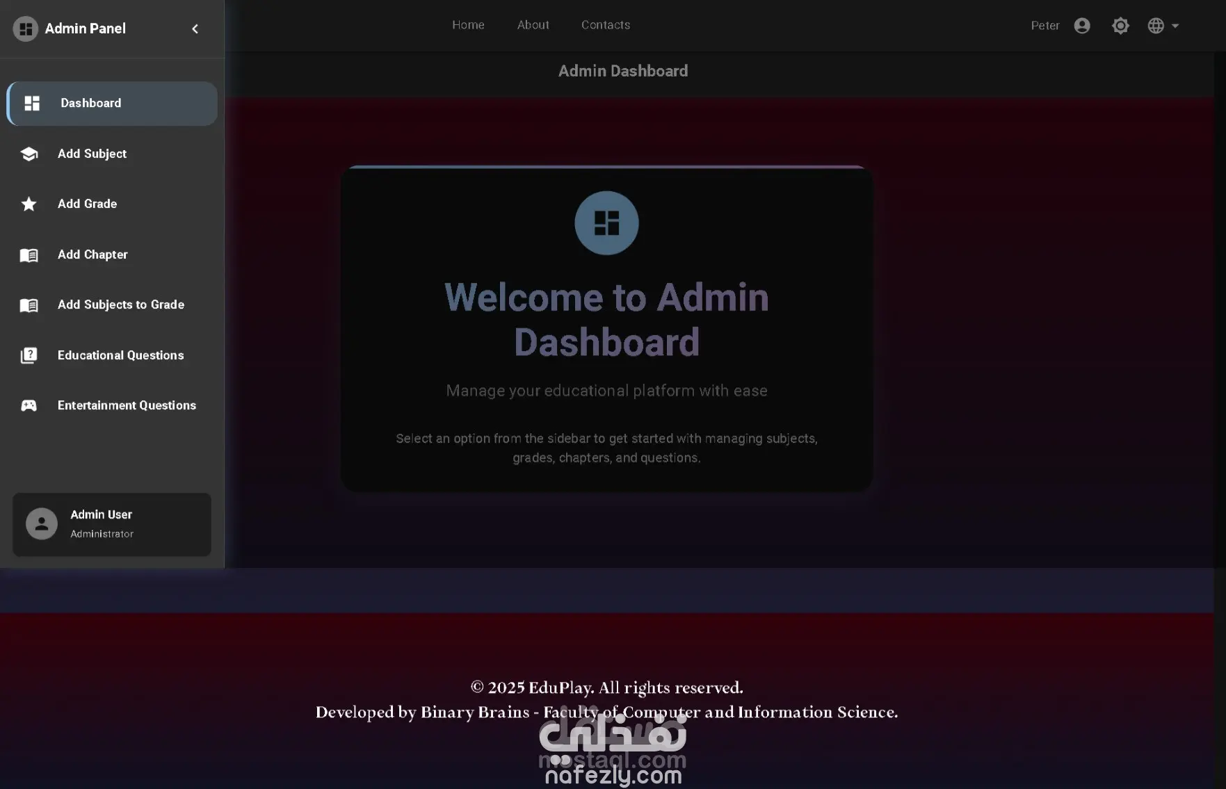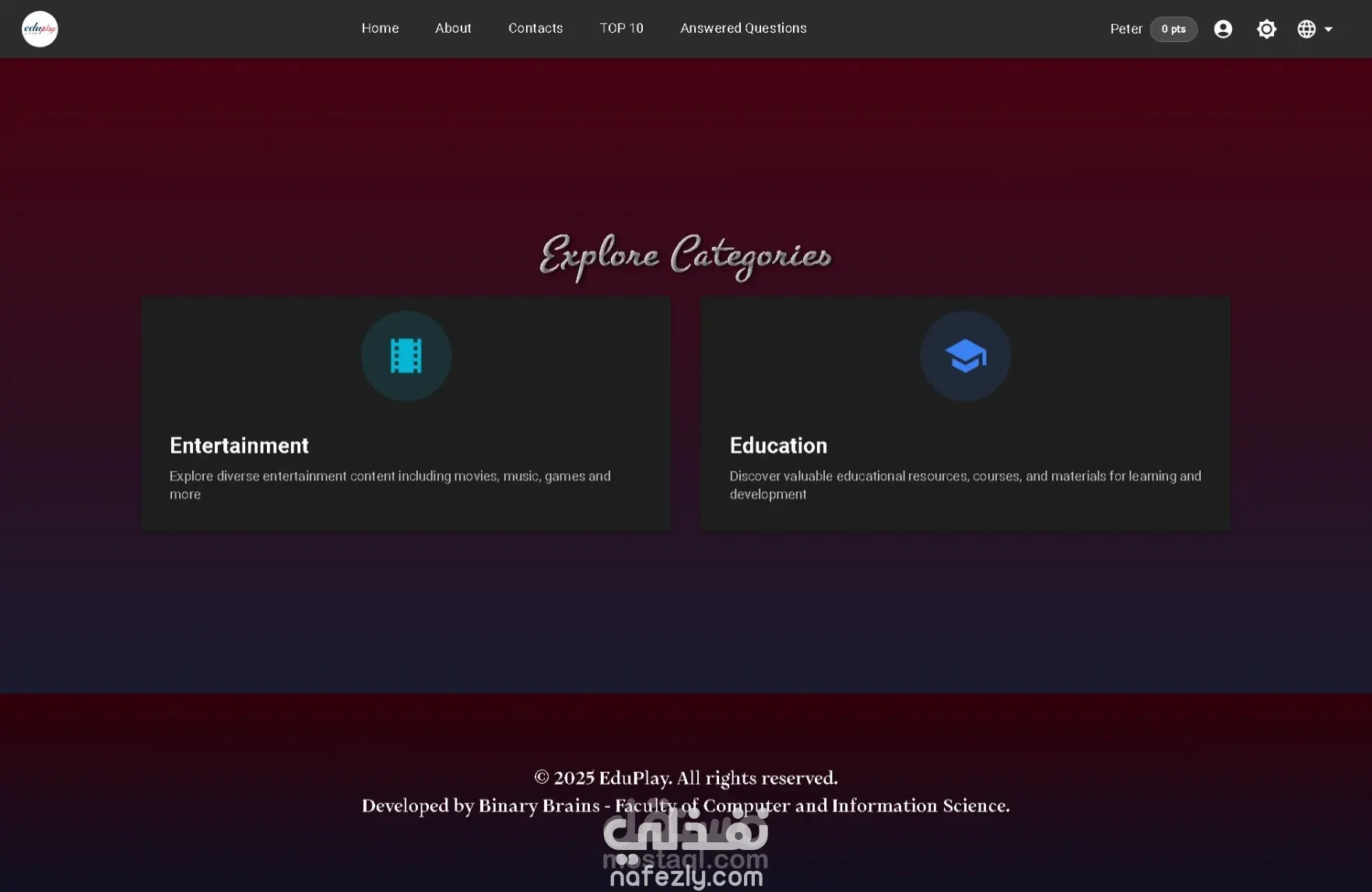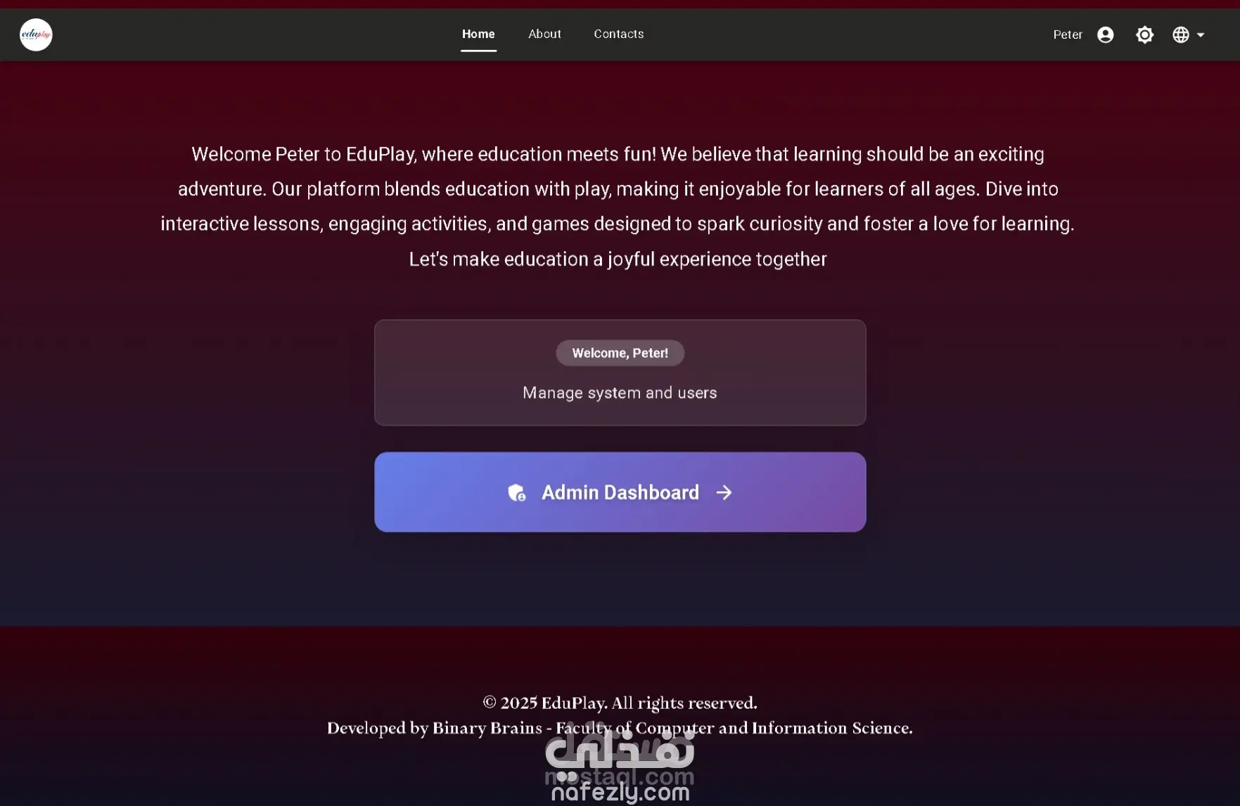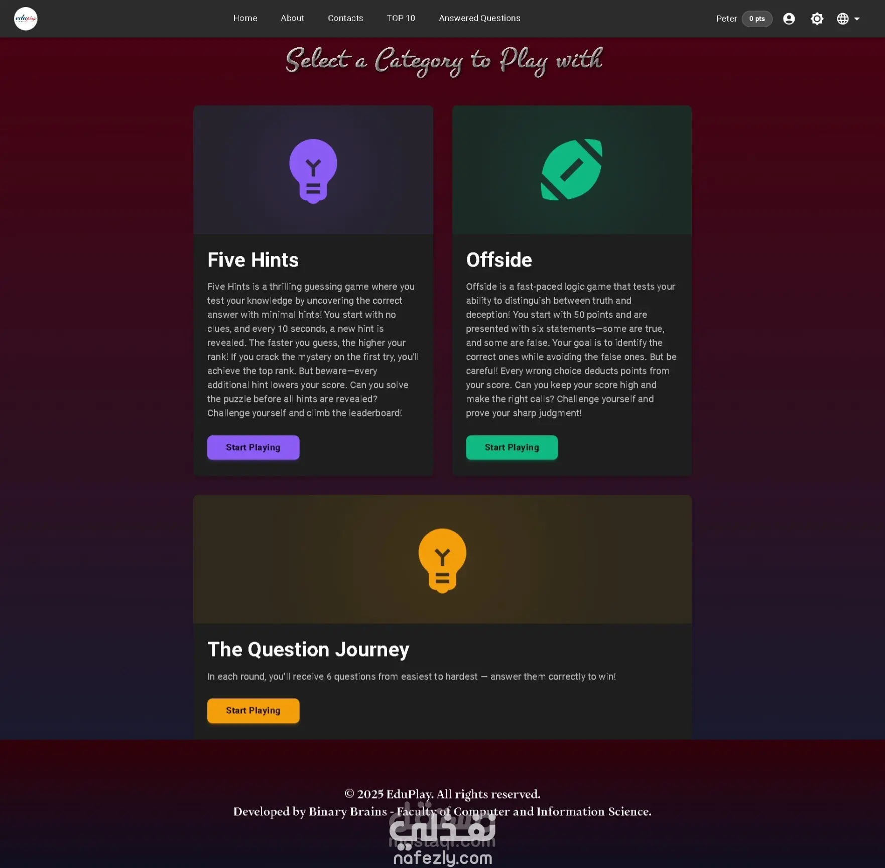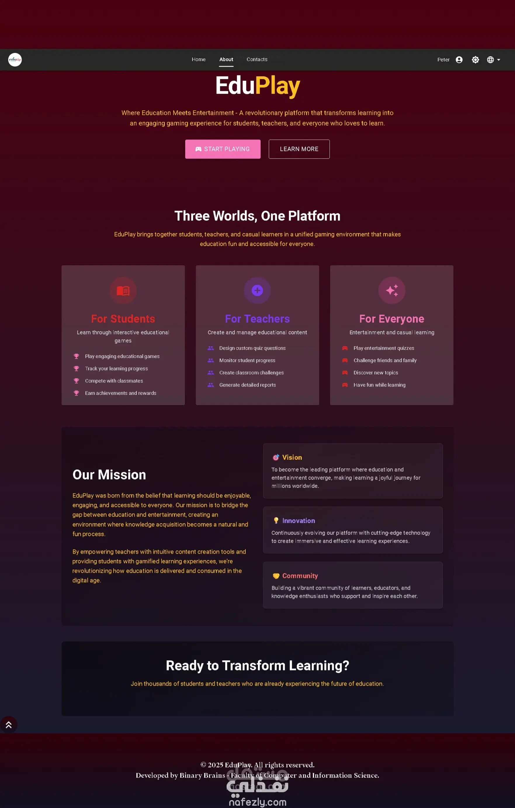 مشروع منصة "EduPlay": حيث يصبح التعليم لعبة ممتعة "EduPlay" هو مشروع منصة ويب تفاعلية قمت بتطويرها، مبنية على مفهوم "التعليم الترفيهي" (Edutainment). الهدف الأساسي للمشروع هو تحويل المواد التعليمية إلى ألعاب شيقة وتحديات، مما يساعد المستخدمين (خاصة الطلاب) على التعلم والاستيعاب بطريقة غير مملة. بالإضافة إلى الجانب التعليمي، يتضمن الموقع قسماً مستقلاً للترفيه العام، يحتوي على أسئلة وألغاز خفيفة، مما يوفر تجربة متكاملة تجمع بين الفائدة والمتعة في مكان واحد. لقد كنت مسوؤل علي بناء الواجهه الخلفية بالاضافة الي فريق قام بتصميم الواجهه الامامية