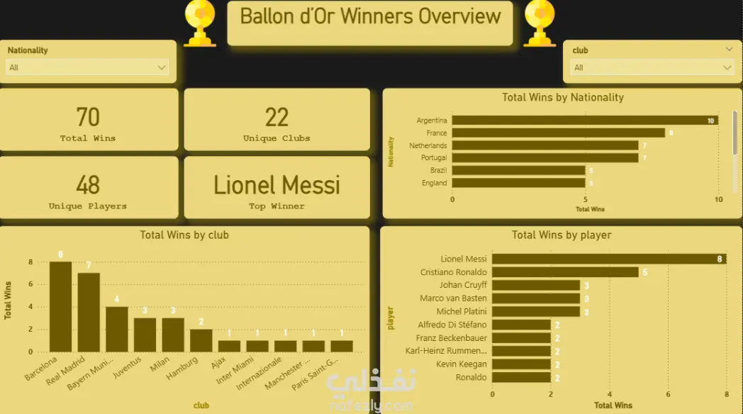 This project provides a comprehensive historical analysis of the Ballon d'Or award winners, covering the period from 1956 up to 2025 (including historical data and future projections/hypothetical data). The analysis is presented through an interactive dashboard built using Microsoft Power BI, designed to explore key trends such as the distribution of winners by Nationality, Club, and the frequency of wins across different eras.