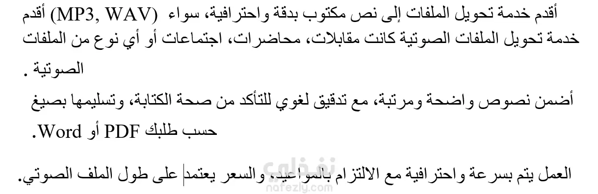 خدمة تحويل الملفات إلى نص مكتوب بدقة واحترافية، سواء (MP3, WAV) أقدم خدمة تحويل الملفات الصوتية كانت مقابلات، محاضرات، اجتماعات أو أي نوع من الملفات الصوتية .