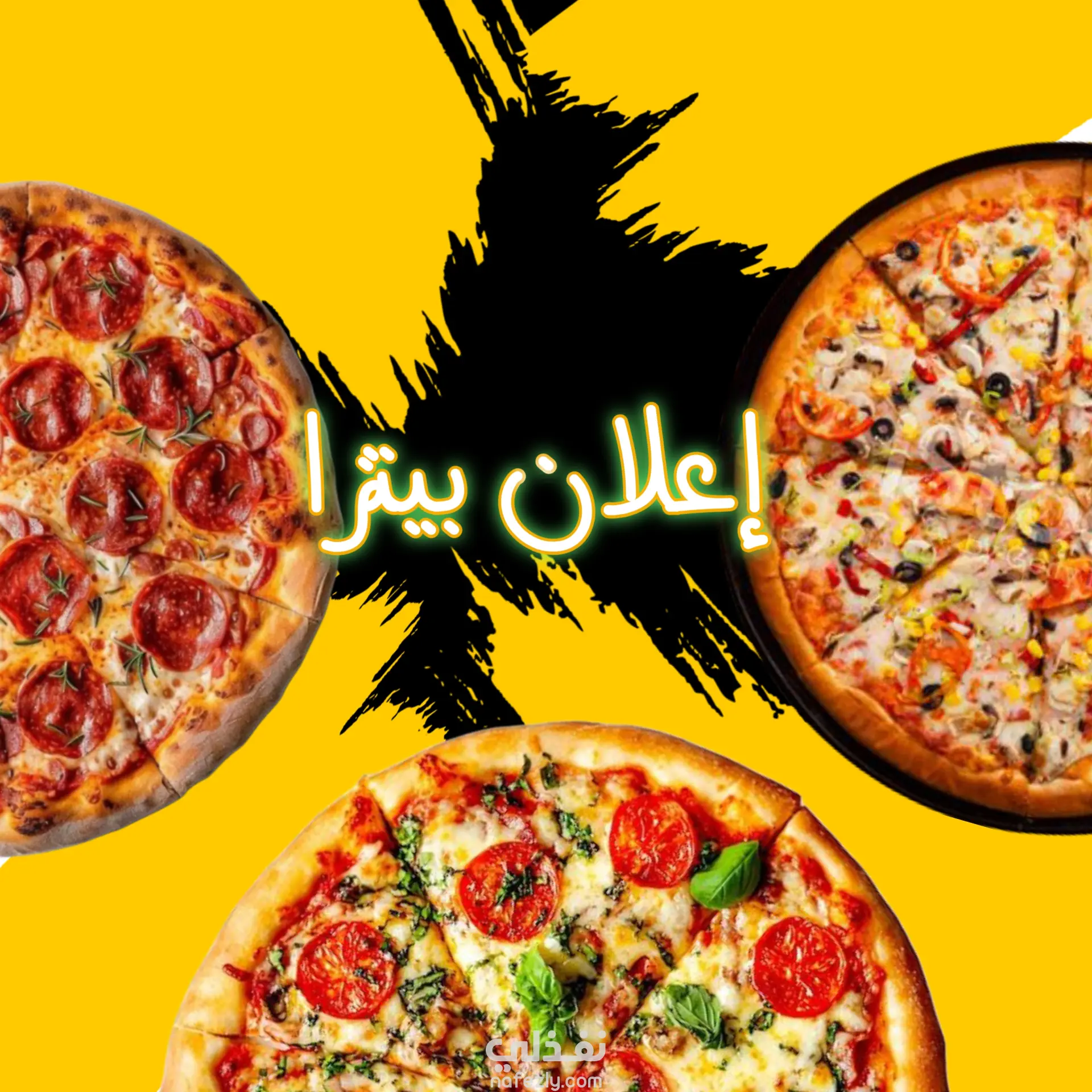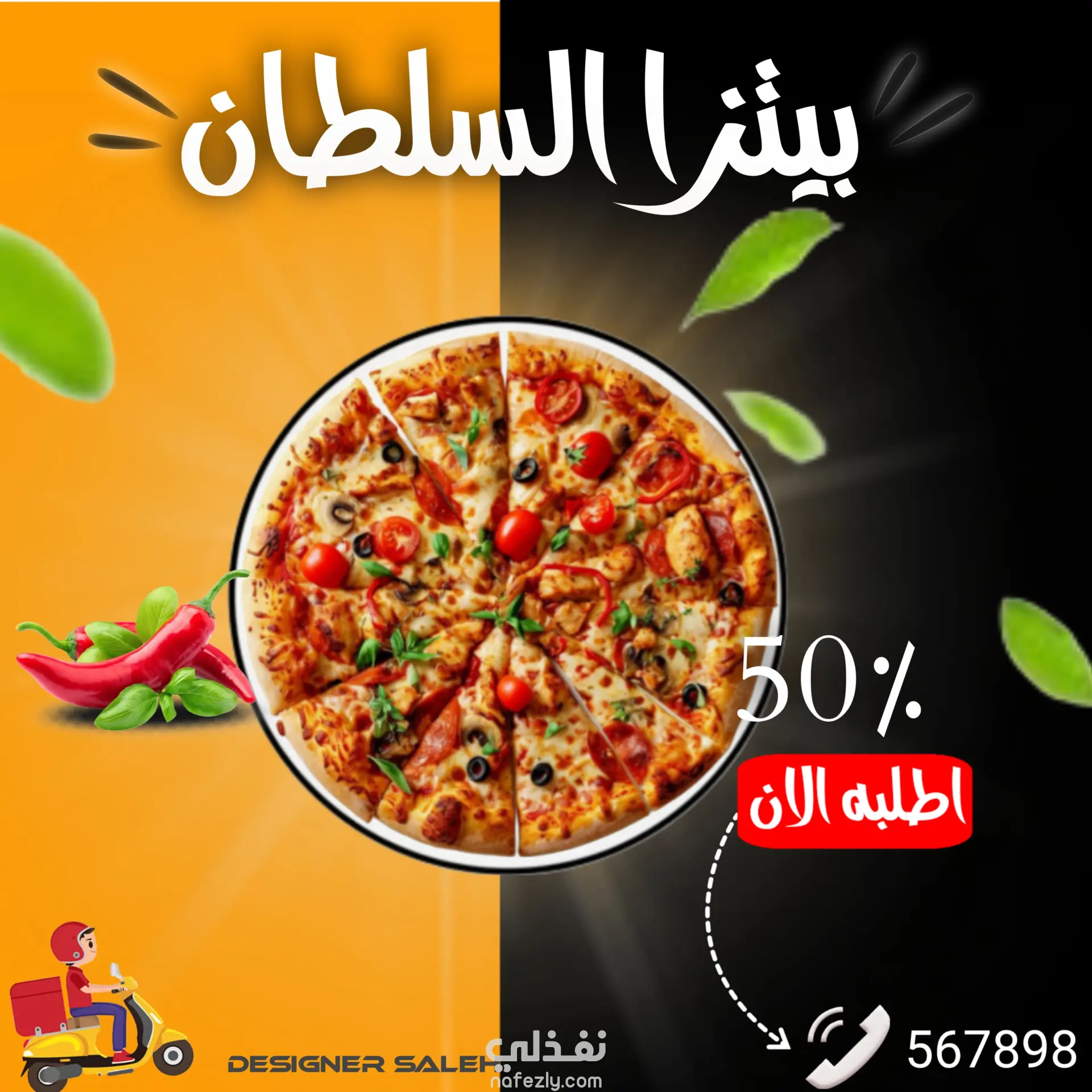 صورة إعلانية لمطعم بيتزا 🍕 تجمع بين الهوية البصرية الخاصة بالمطعم والبيتزا تضهر تفاصيل البيتزا والخصم والعنوان بشكل ممتاز وجميل