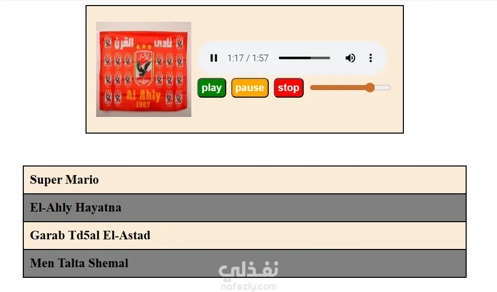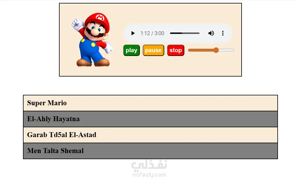تصميم مشغل موسيقى بسيط يحاكى برامج ال MP3 ولكن داخل المتصفح. الهدف من المشروع هو بناء واجهة بسيطه وجذابه مع تحكم كامل ف الملفات الصوتية باستخدام لغة JavaScript دون الاعتماد على مكتبات خارجية.