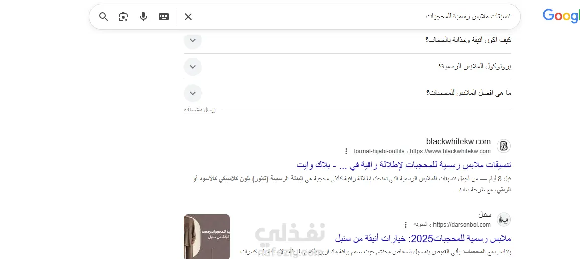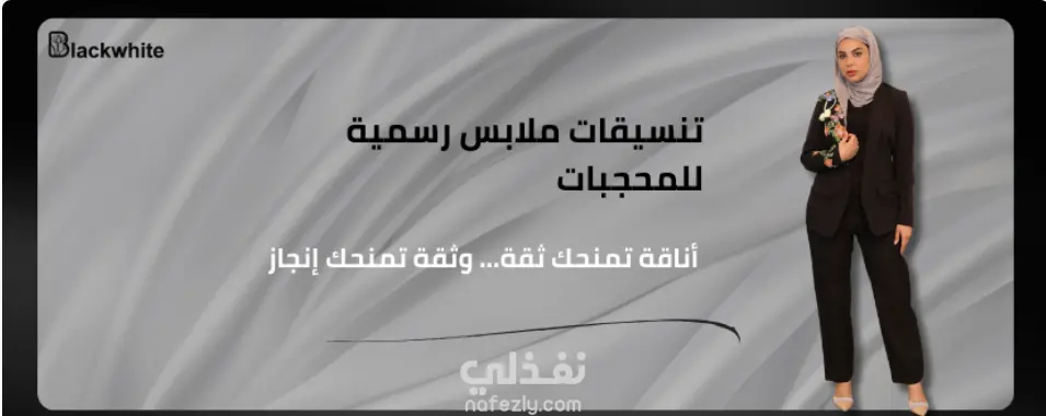 مقال على موقع بلاك وايت الكويتي Blackwhite المحتوى: من أجمل تنسيقات الملابس الرسمية التي تمنحك إطلالة راقية كأنثى محجبة هي البدلة الرسمية (تايّور) بلون كلاسيكي كالأسود أو الزيتي، مع طرحة سادة وإكسسوارات بسيطة تضيف لمسة من الأناقة. ولإطلالة أكثر أنوثة، يبرزفستان طويل محتشم بقصّة كلوش أو مستقيمة من قماش فاخر كالجاكار، ونسّقيه مع جاكيت قصير لحضور لافت ومختلف. أما للإطلالات العملية النهارية في المكتب، يبقى الخيار الأكثر أناقة بنطال واسع كلاسيكي مع قميص ساتان أو بلوزة ناعمة، فوقهما جاكيت رسمي قصير أو طويل بحسب ذوقك. أما إذا كنتِ تفضلين الراحة دون التخلي عن الطابع الرسمي، فجربي تنورة طويلة ميدي أو مستقيمة مع بلوزة بسيطة وسترة رسمية خفيفة.