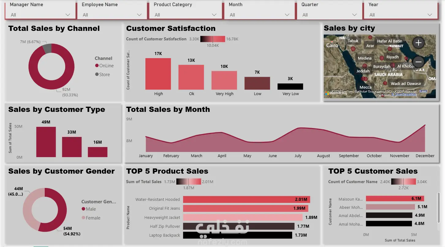اكتساح الـ Online: كشف التحليل أن المبيعات عبر الإنترنت تمثل 93.33% (92 مليون)، بينما المتجر الفعلي لا يمثل سوى جزء بسيط. هذا يعني أن "الاستثمار في المنصات الرقمية" هو المحرك الفعلي لنمو هذا البيزنس.