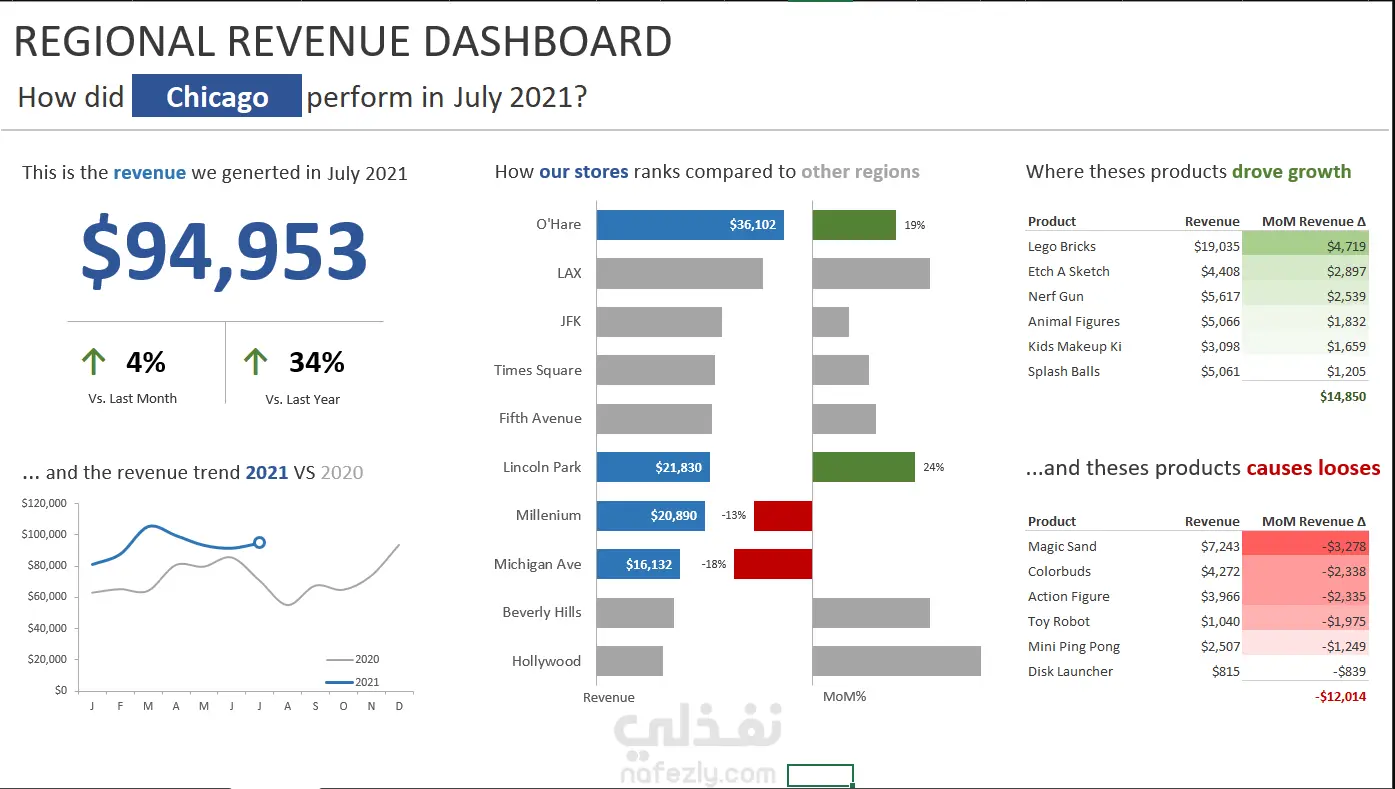 لوحة تحكم الإيرادات الإقليمية – Excel Dashboard