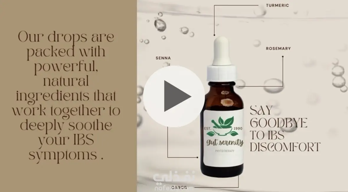 The video is a short promotional clip advertising a natural herbal drops product designed to relieve irritable bowel syndrome (IBS) discomfort. It visually highlights a dropper bottle and emphasizes that the formula combines multiple plant-based ingredients—including turmeric, rosemary, senna, and carob—that are presented as working together to soothe digestive symptoms. The messaging focuses on a natural, gentle approach to gut health and concludes with a clear call-to-action encouraging viewers to “say goodbye to IBS discomfort.”