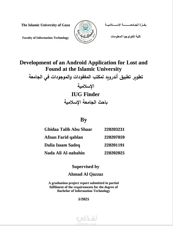 يُعد مشروع IUG Finder تطبيقًا متكاملًا لإدارة عمليات المفقودات والموجودات داخل الحرم الجامعي، ويهدف إلى تسهيل عملية الإبلاغ والبحث عن الأغراض المفقودة أو المعثور عليها بطريقة منظمة وآمنة. جاء هذا المشروع استجابةً للحاجة إلى نظام مركزي يقلل من ضياع الممتلكات ويساعد الطلبة وموظفي الجامعة على استعادتها بسرعة وسهولة. يوفر التطبيق مجموعة من الخصائص الأساسية، من بينها إضافة بلاغات جديدة للمفقودات أو الموجودات، تصفح المشاريع والبلاغات، عرض الأعمال السابقة، وإدارة العروض المقدمة. كما يتيح للمستخدم البحث عن العناصر، تصفح معرض الأعمال، والاطلاع على أقسام وتصنيفات المشاريع المختلفة، بما يشمل مجالات البرمجة، التصميم، الهندسة، التسويق، الكتابة، الدعم، والتدريب. تم تطوير الواجهة الأمامية للتطبيق باستخدام Flutter، مما يسمح بتشغيله على أنظمة Android وiOS من خلال قاعدة كود واحدة، مع واجهات استخدام بسيطة وسهلة. أما الخادم والخدمات الخلفية فقد تم تنفيذها باستخدام Node.js وExpress، حيث يتولى النظام إدارة البلاغات، التحقق من هوية المستخدمين، وتخزين البيانات في قاعدة بيانات مخصصة، إضافةً إلى تسهيل عمليات البحث والتواصل بين المستخدمين. يقتصر استخدام التطبيق على مجتمع الجامعة فقط، حيث يتم ربط الحسابات بالبريد الجامعي أو الرقم الجامعي، مع تحديد نطاق البلاغات داخل الحرم الجامعي، وذلك لضمان أمان البيانات وخصوصية المستخدمين. يهدف المشروع في مجمله إلى تحسين تجربة الطلبة، توفير الوقت والجهد، وتعزيز روح التعاون داخل البيئة الجامعية من خلال حل تقني عملي وفعّال.