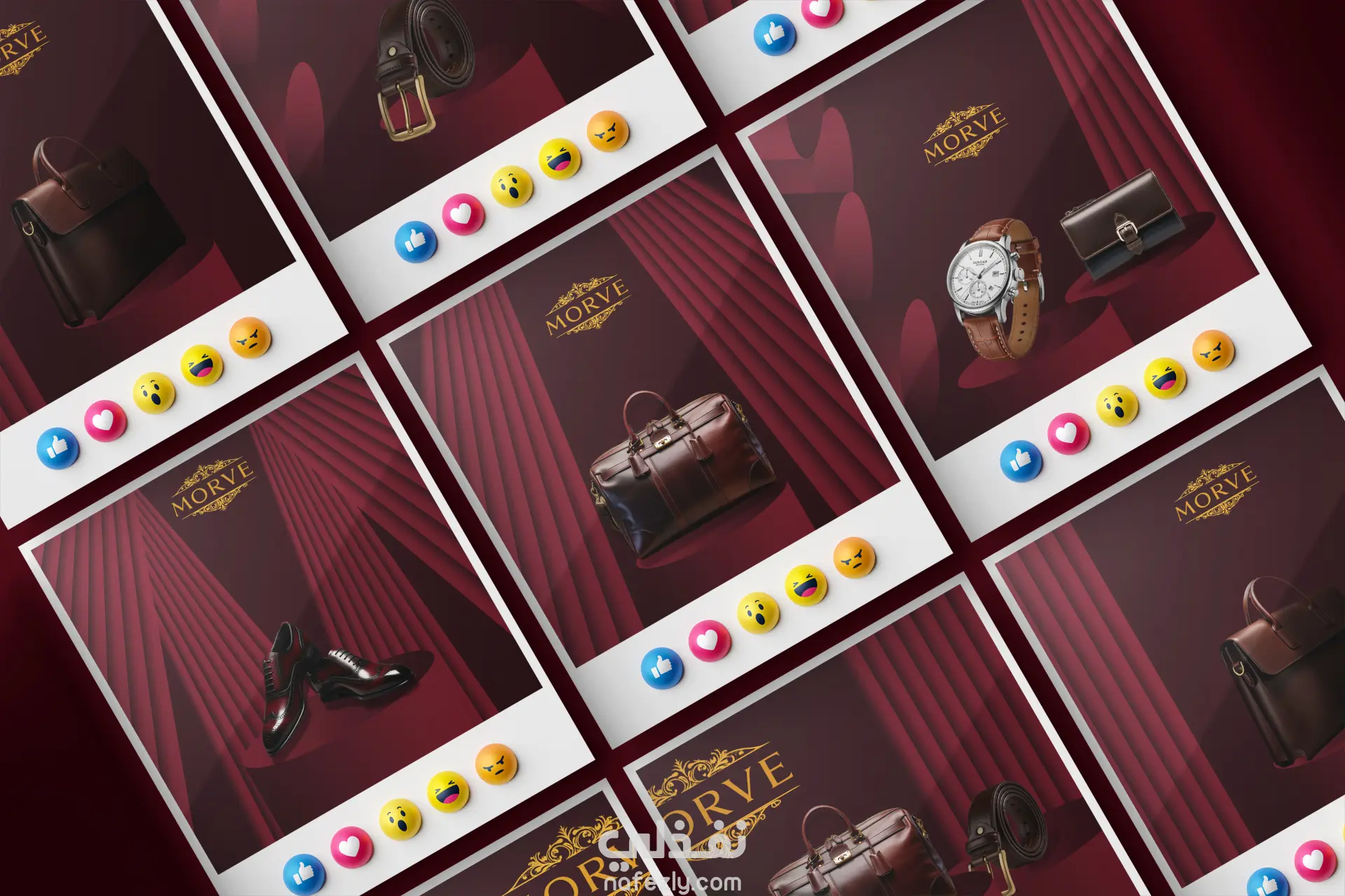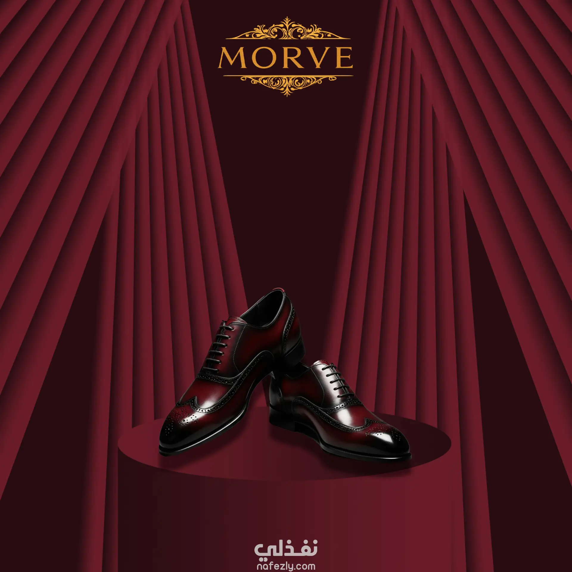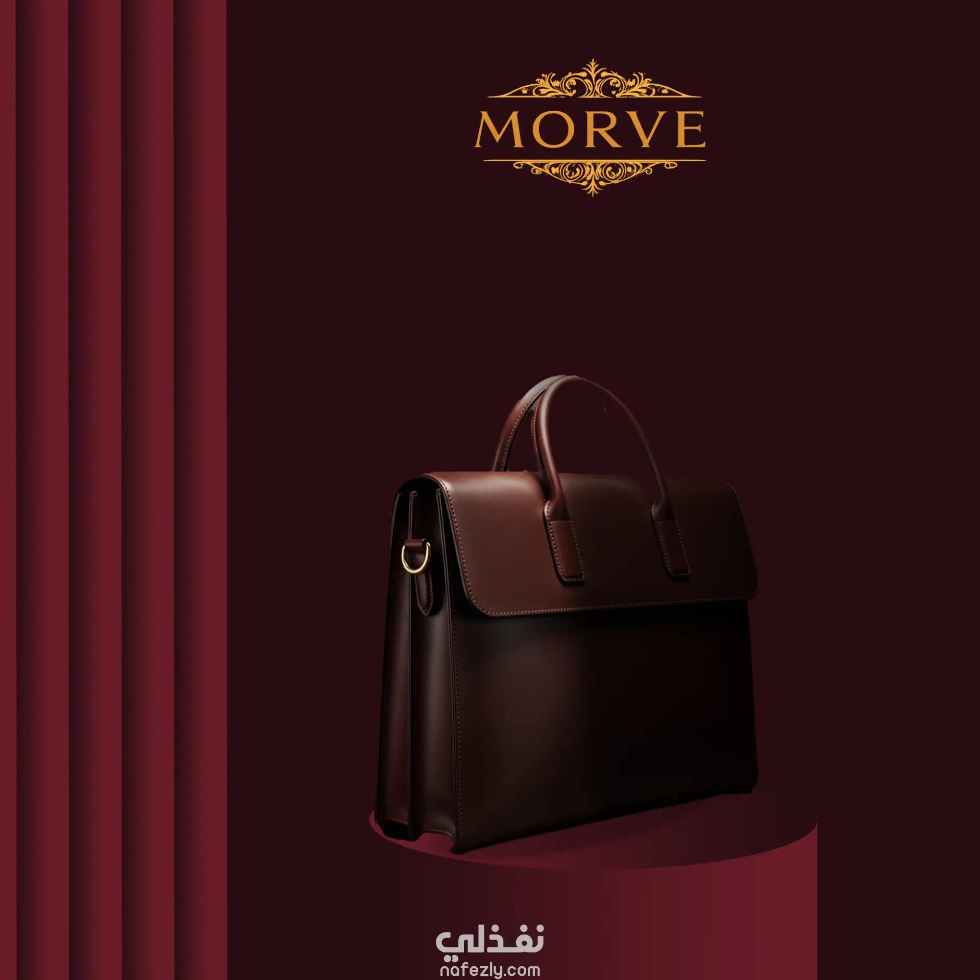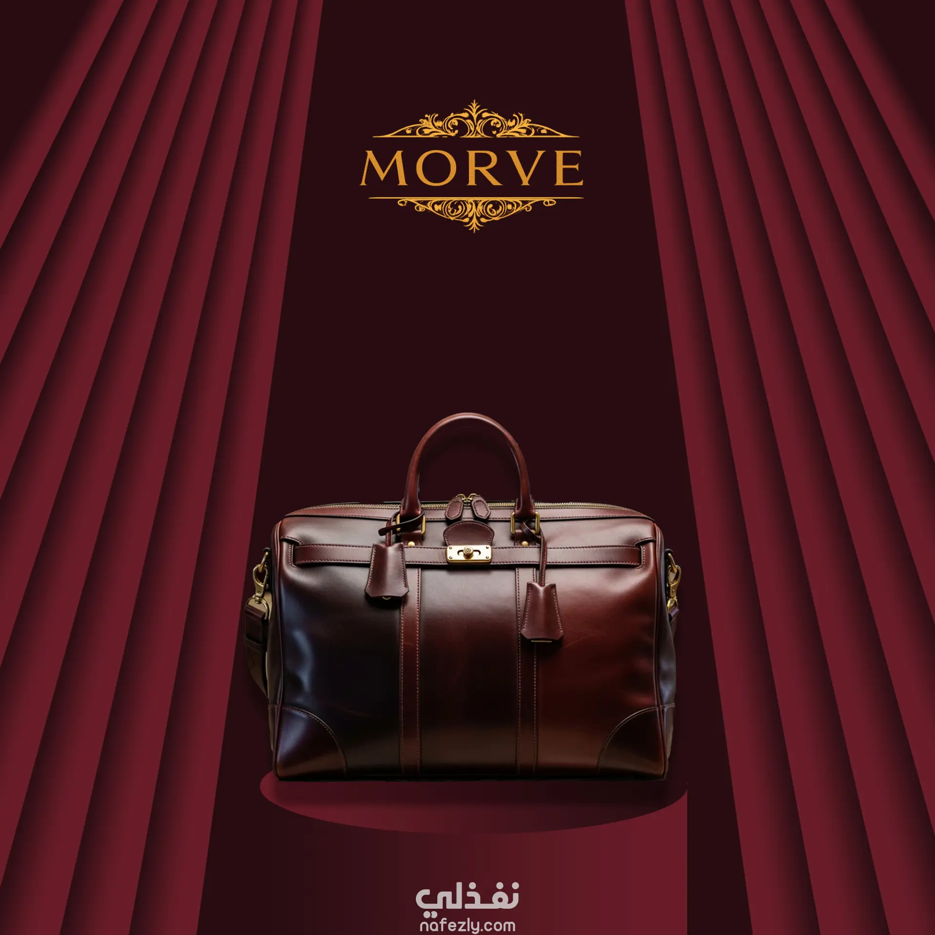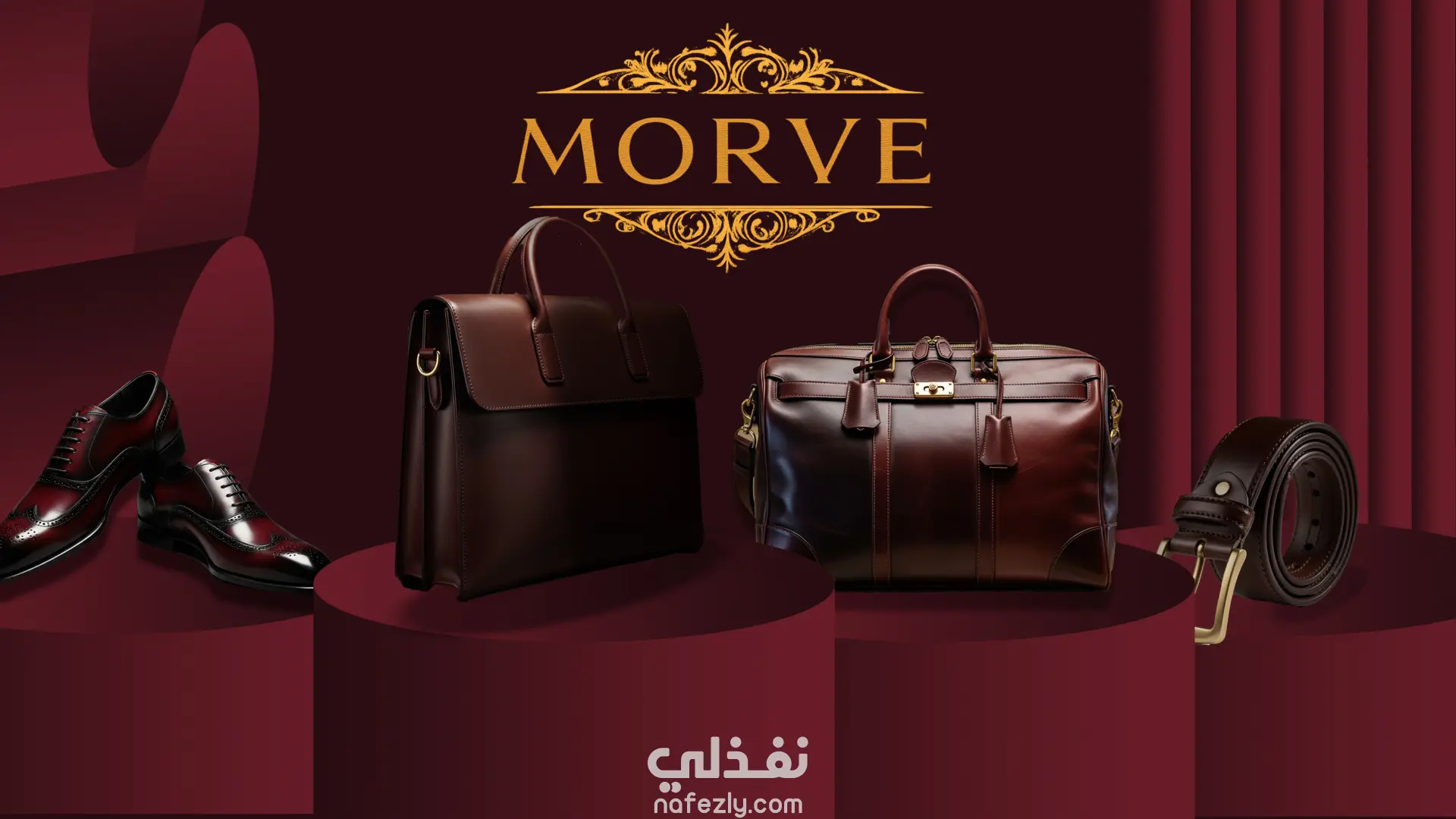The concept is based on a luxury stage presentation, using deep red tones, golden accents, and theatrical curtains to highlight the premium value of leather products.