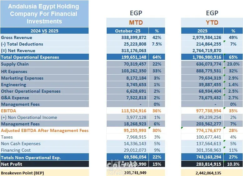 لعمل الذي أرسلته هو عبارة عن تقرير مالي تحليلي يركز على النقاط التالية: النوع: قائمة دخل وأداء تشغيلي (Income Statement & Operating Performance). الهدف: مقارنة الأداء المالي (MTD و YTD) للعام 2025 مقابل 2024 وتحليل نسبة التغير (%). المقاييس الرئيسية المُركَّز عليها: الإيرادات بأنواعها (Gross, Net). التكاليف التشغيلية التفصيلية (Supply Chain, HR, Marketing, etc.). مقاييس الربحية الهامة (EBITDA و Net Profit). حساب نقطة التعادل (BEP). الأدوات المستخدمة: إشارتم إلى ضرورة استخدام Excel & Macro لإعداد وأتمتة هذا النوع من التقارير المعقدة.