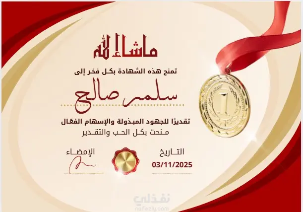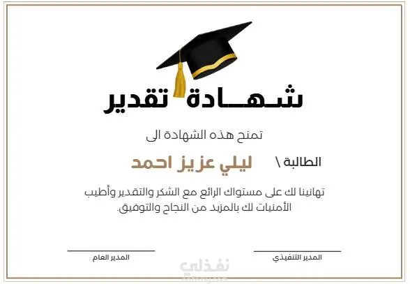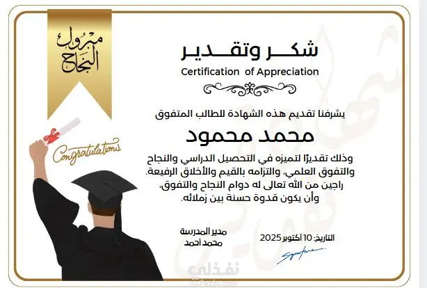 حضرتك معلم وحابب تكرم الطلبة المتفوقين في مادتك بشهادة تقدير حلوة تكرمهم بيها ؟ تعالى عندنا هنصمم لك شهادات تقدير بأشكال مختلفة وهتعجبك إن شاء الله وهتلاقي : - شهادات تقدير بأشكال مختلفة وهتعجبك -تسليم التصميم بأعلى جودة بصيغة png -تسليم التصميم بصيغة pdf في حالة الطباعة