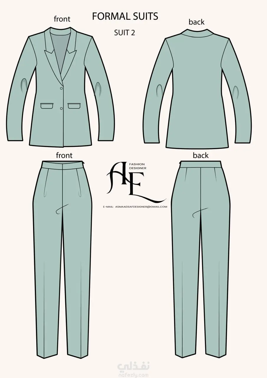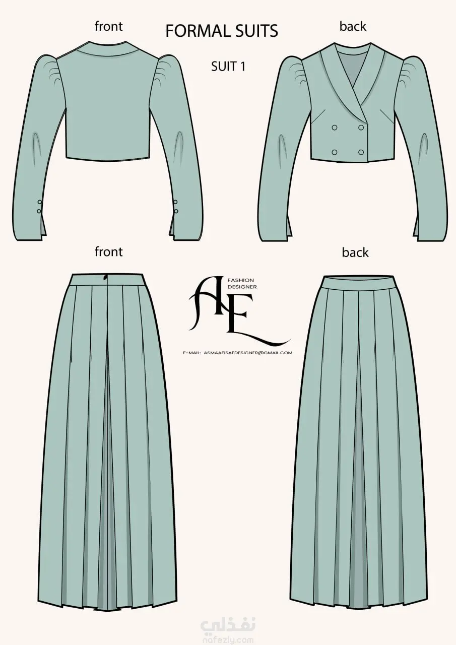 تصميم بدلة نسائية فورمال جاكيت وتنورة طويلة وبدلة أخرى جاكيت وسروال