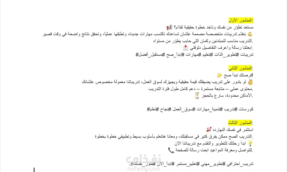 يقوم بكتابة 3 منشورات خاصة بتقديم التدريبات يتم تنزيلها على فيسبوك تتضمن الهاشتاج