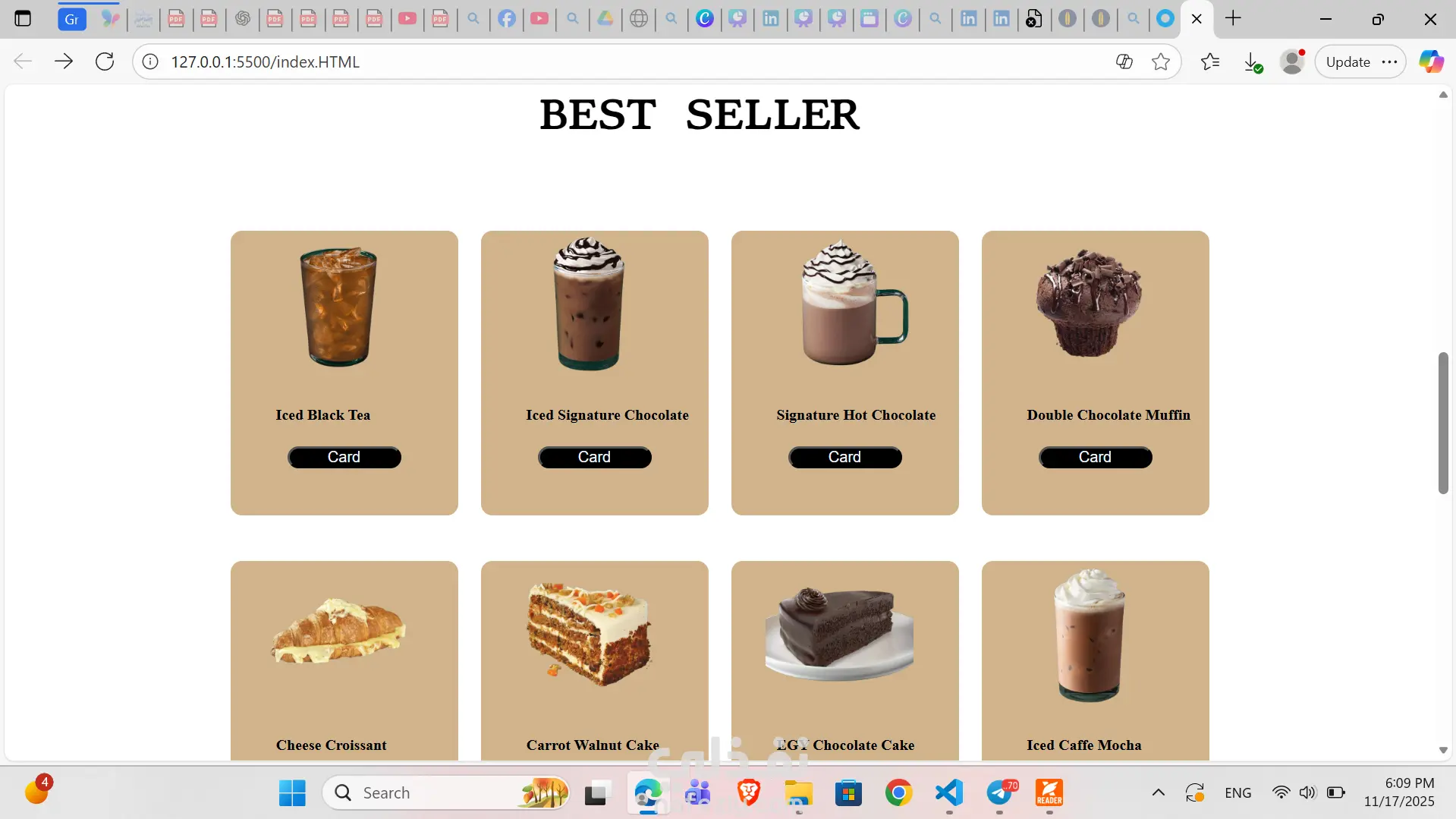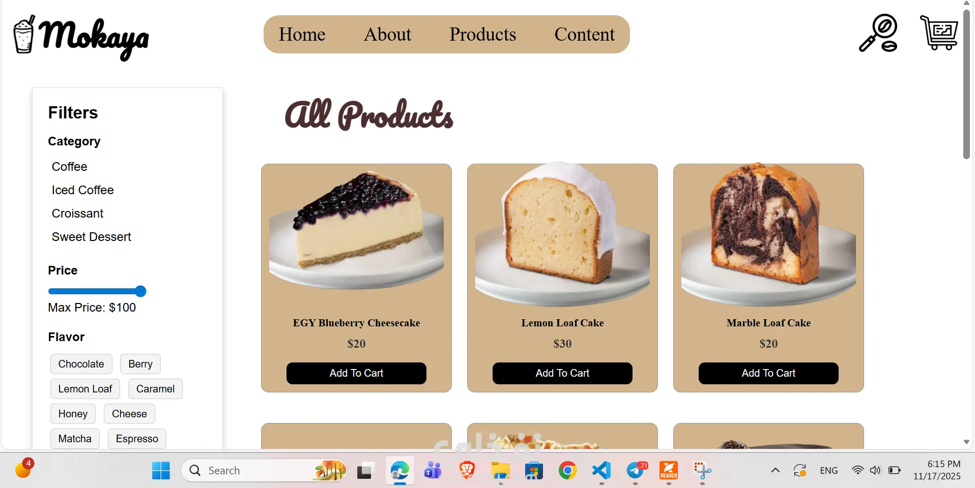موقع إلكتروني لمقهى افتراضي يُعرض فيه المنتجات بطريقة منظمة وجذابة. الموقع يحتوي على أقسام للمنتجات مثل القهوة، القهوة المثلجة، الكرواسون، والحلويات، مع إمكانية عرض كل قسم على حدة. الموقع مصمم بشكل عصري وسهل التصفح، ويوفر تجربة مستخدم سلسة للزائرين.