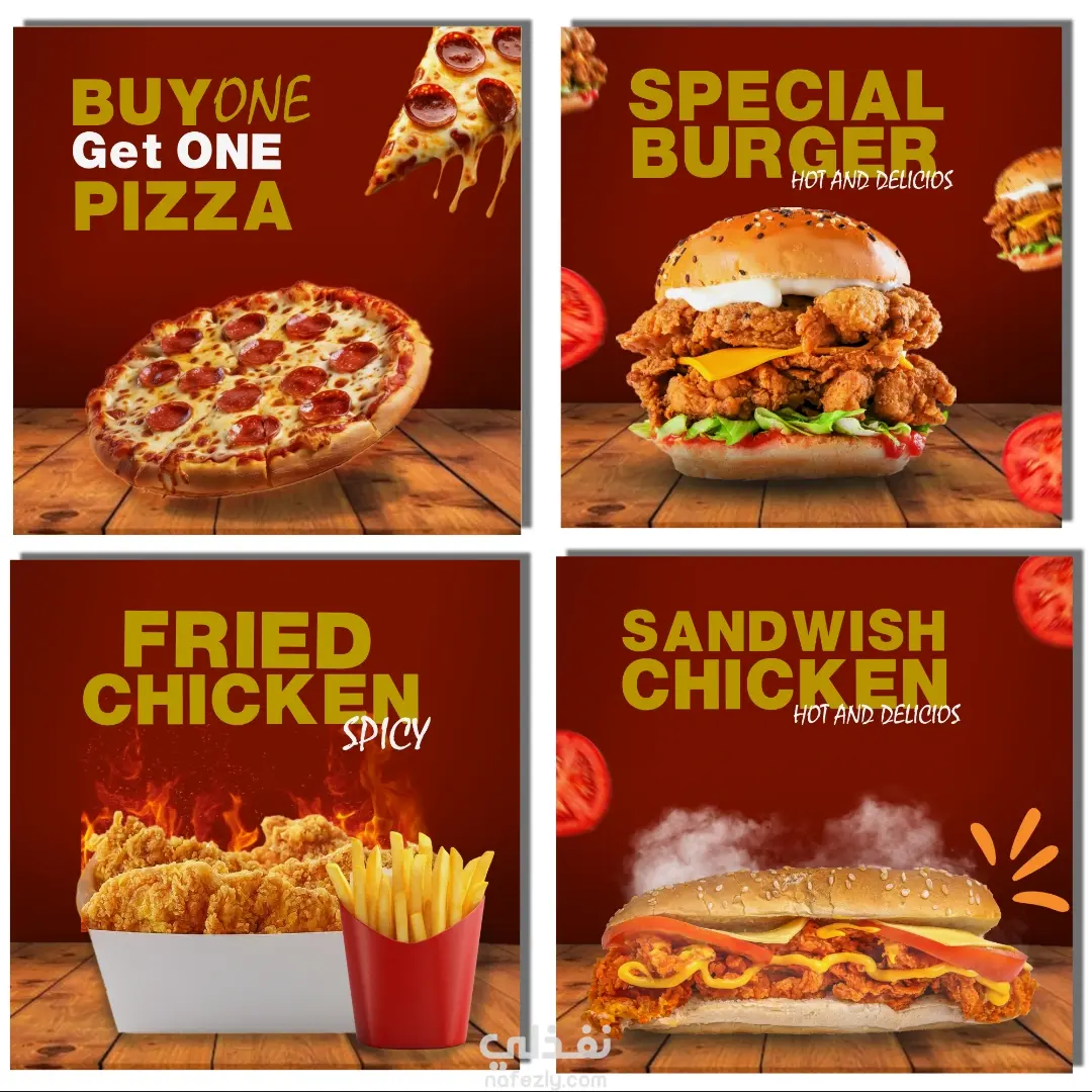 صممت 4 بوستات سوشيال ميديا لمطعم وجبات سريعه مراعيه الالوان والهويه البصريه الخاصه به.