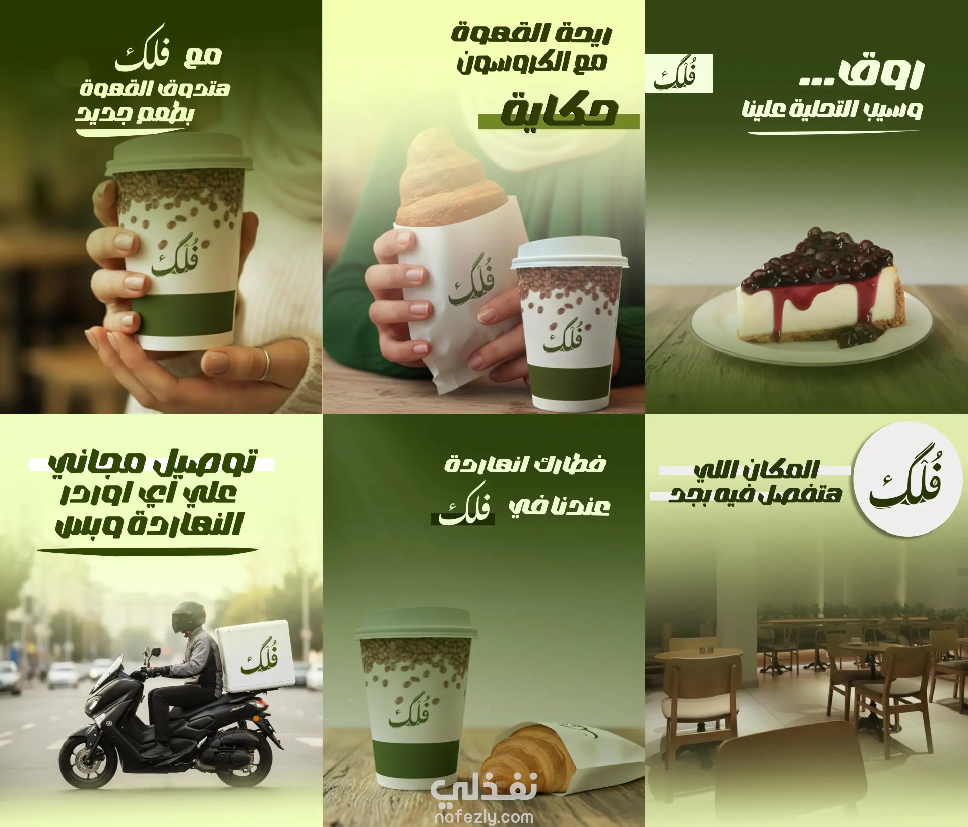 قمت بعمل 6 تصاميم سوشيال ميديا لكافيه فلك باستخدام برامج التصميم ومراعاه الهويه البصريه والالوان.