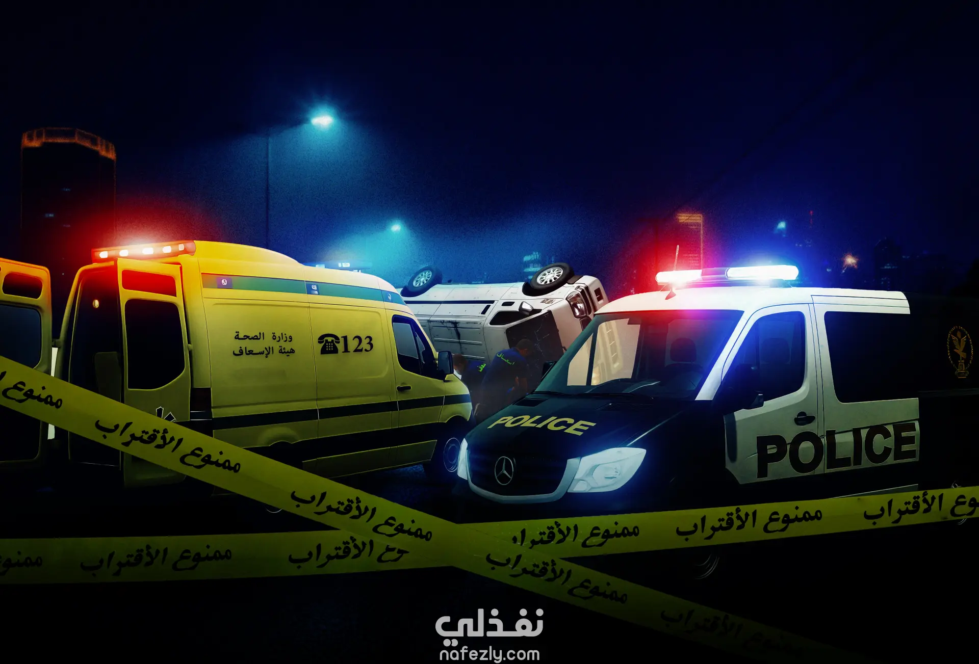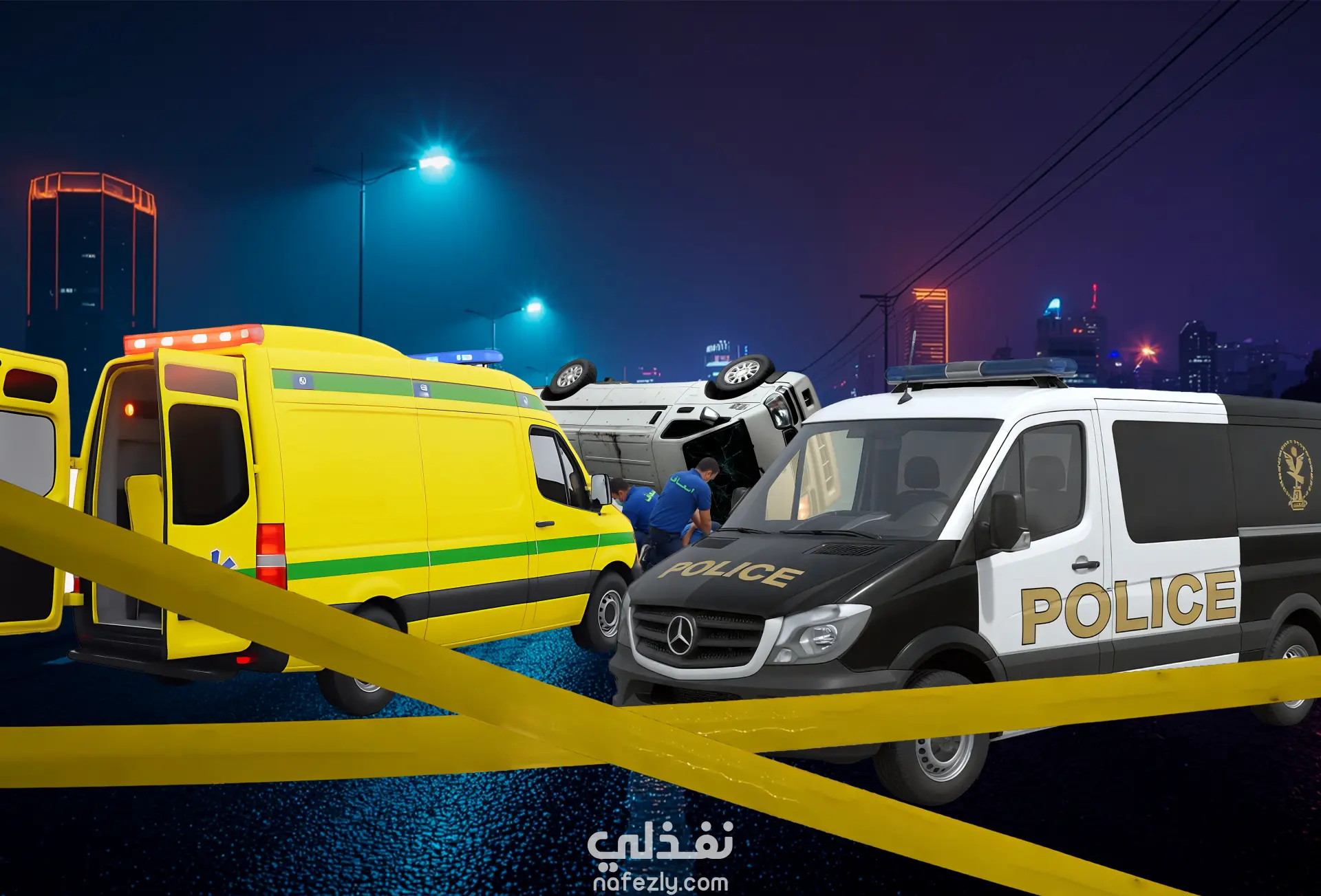 "A visual composite design depicting a nighttime accident scene in the city, featuring police and ambulance vehicles. The scene is enhanced with dramatic elements such as caution tape, emergency lights, and a balanced use of color and contrast to create a cinematic atmosphere.