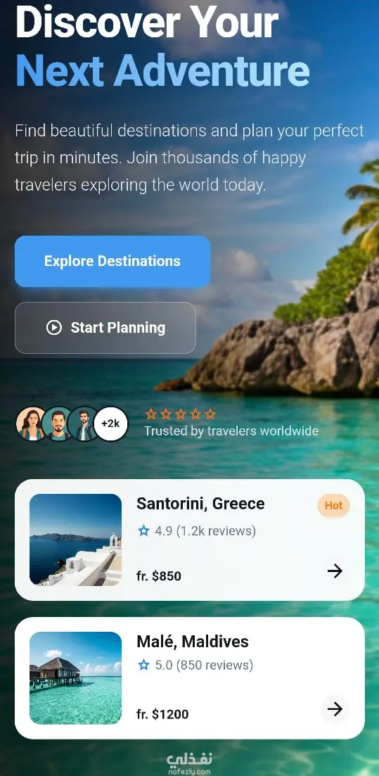 تصميم وتنفيذ Hero Section لواجهة موقع سياحي باستخدام HTML وCSS وJavaScript. يشمل خلفية عالية الجودة، نصوص واضحة، زر CTA، وتصميم يعكس روح السفر والمغامرة. تم التركيز على Responsive Design، نظافة الكود، وتجربة المستخدم.