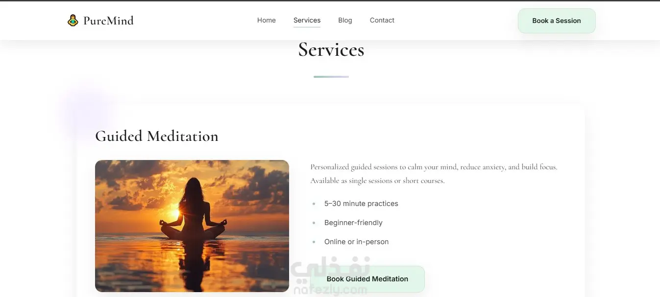 PureMind is a modern, high-fidelity web application designed for a holistic wellness and mindfulness practice. The platform serves as a digital sanctuary, providing users with a seamless interface to explore guided meditation, yoga therapy, and holistic healing services. Its design philosophy centers on tranquility, accessibility, and professional credibility, utilizing a soft color palette and intuitive navigation to mirror the "calm and clear" experience it promotes.