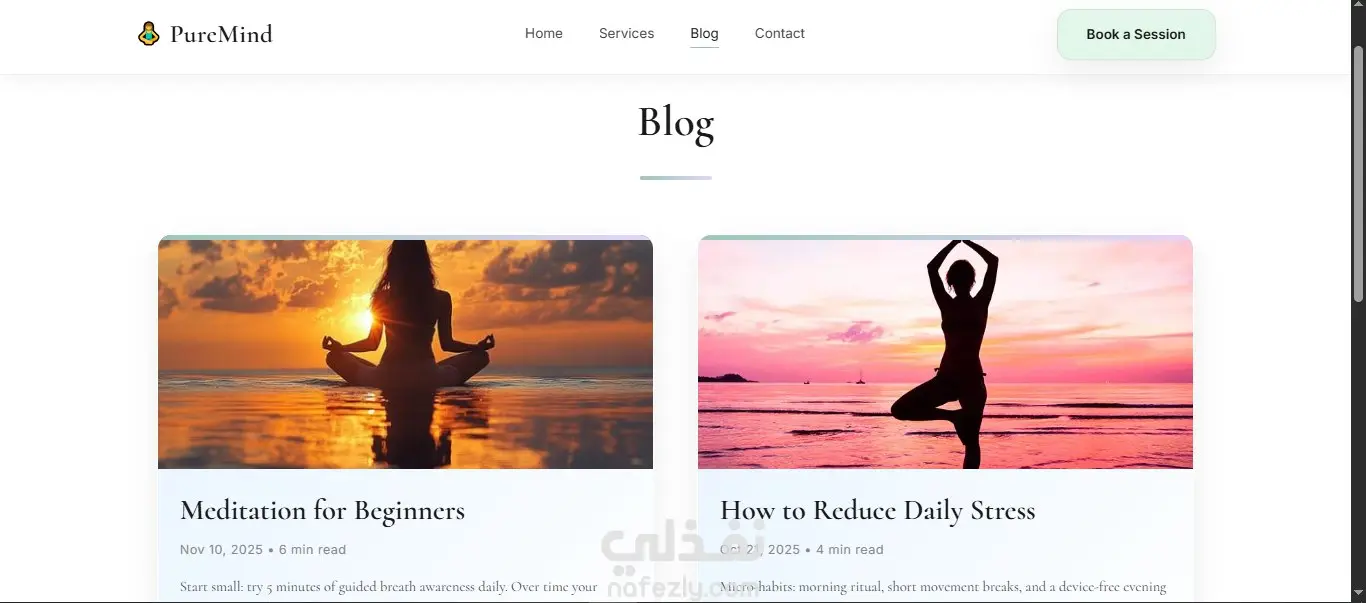 The Blog section acts as a content hub for mindfulness education. It provides users with value-driven articles like "Meditation for Beginners" and "How to Reduce Daily Stress," complete with metadata such as publication dates and estimated read times to enhance user engagement and SEO.