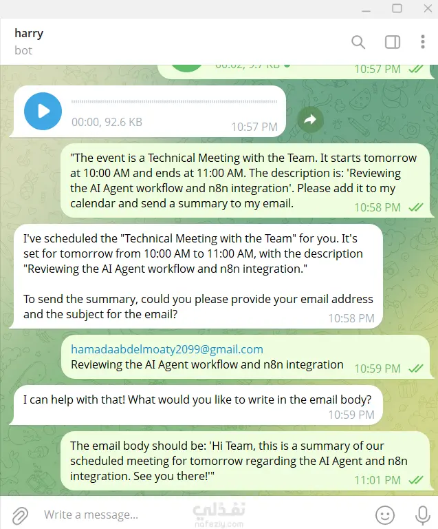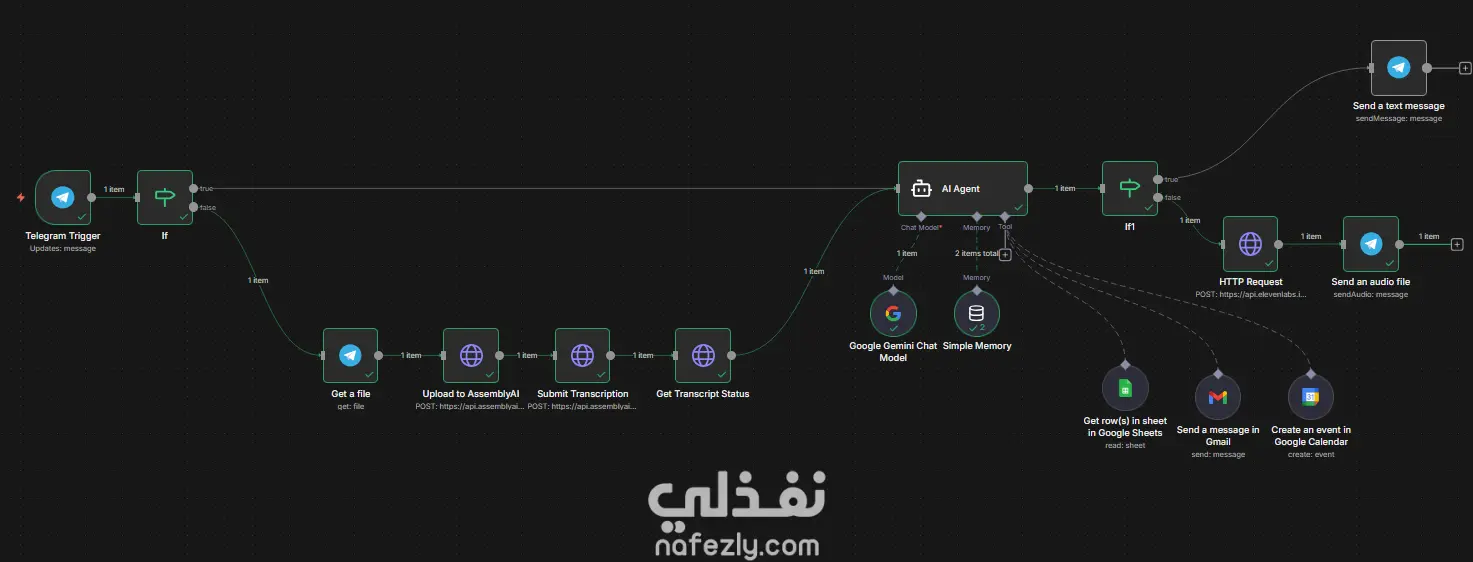 وصف المشروع: قمت بتصميم وتطوير نظام أتمتة متقدم (Workflow) باستخدام منصة n8n، يعمل كوكيل ذكي (AI Agent) عبر تطبيق تلجرام. يتميز النظام بالقدرة على معالجة المدخلات النصية والصوتية وتحويلها إلى إجراءات عملية داخل أدوات العمل اليومية. المميزات التقنية للمشروع: 1.معالجة الصوت: دمج تقنية AssemblyAI لتحويل الرسائل الصوتية إلى نصوص بدقة عالية. 2.الذكاء الاصطناعي: استخدام نموذج Google Gemini كمحرك تفكير (Reasoning) لاتخاذ القرارات وفهم نية المستخدم. 3.تحويل النص إلى صوت: دمج ElevenLabs لإرسال ردود صوتية واقعية للمستخدم. التكامل مع الأدوات المكتبية: Google Sheets: لتسجيل البيانات وقراءتها. Gmail: لإرسال رسائل البريد الإلكتروني آلياً. Google Calendar: لجدولة المواعيد والمهام. الذاكرة: تزويد الوكيل الذكي بذاكرة (Simple Memory) لاسترجاع سياق المحادثات السابقة. القيمة المضافة: يساعد هذا المشروع الشركات والأفراد على أتمتة مهامهم الإدارية بالكامل عبر الأوامر الصوتية أو النصية، مما يرفع من كفاءة العمل ويوفر الوقت.