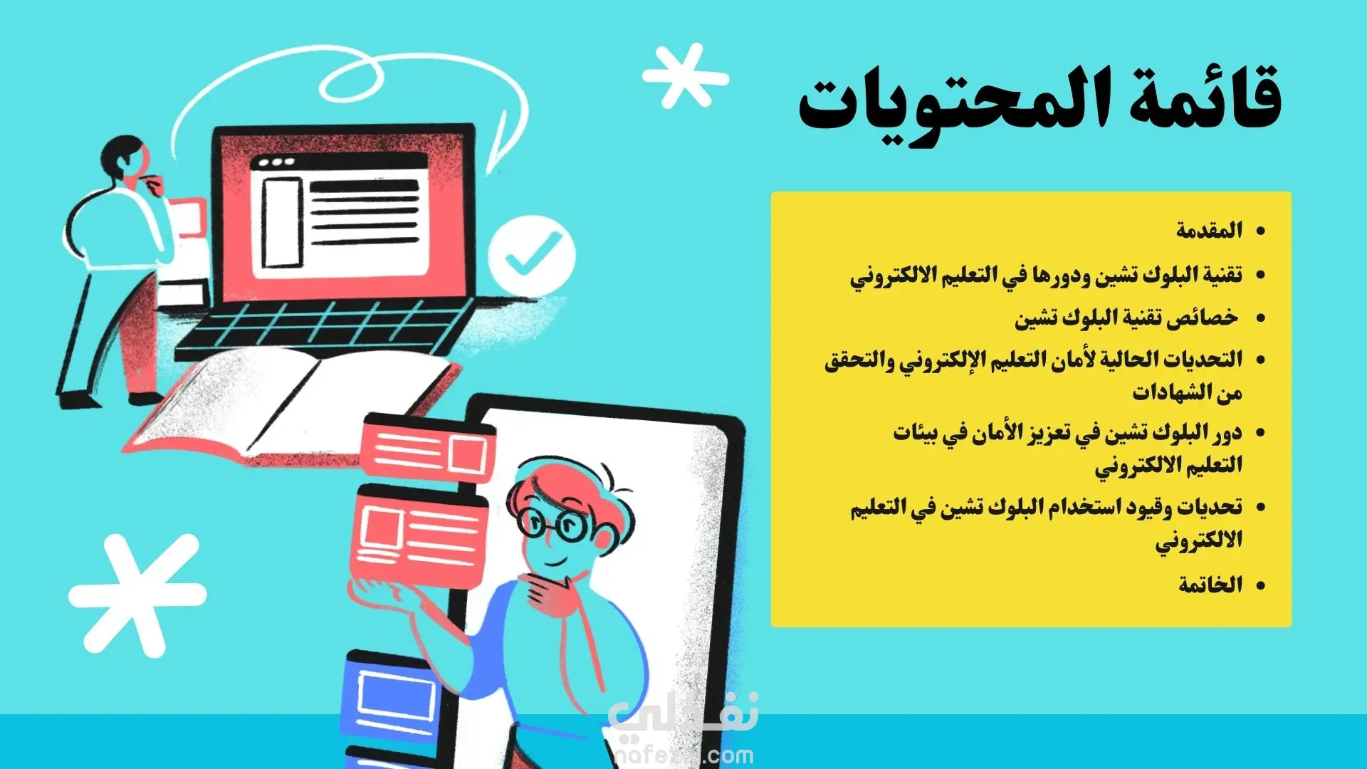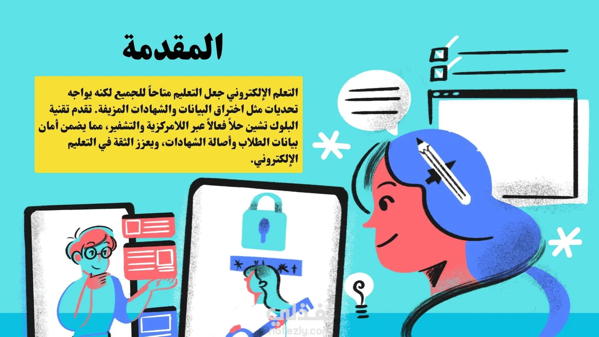 بريزنتيشن عن تقنية البلوك تشين لتعزيز أمان التعليم الألكتروني ( تعريفها وخصائصها والتحديات الحالية لأمان التعليم الإلكتروني والتحقق من الشهاداتودور البلوك تشين في تعزيز الأمان في بيئات التعليم الالكتروني وتحديات وقيود استخدام البلوك تشين في التعليم الالكتروني ).