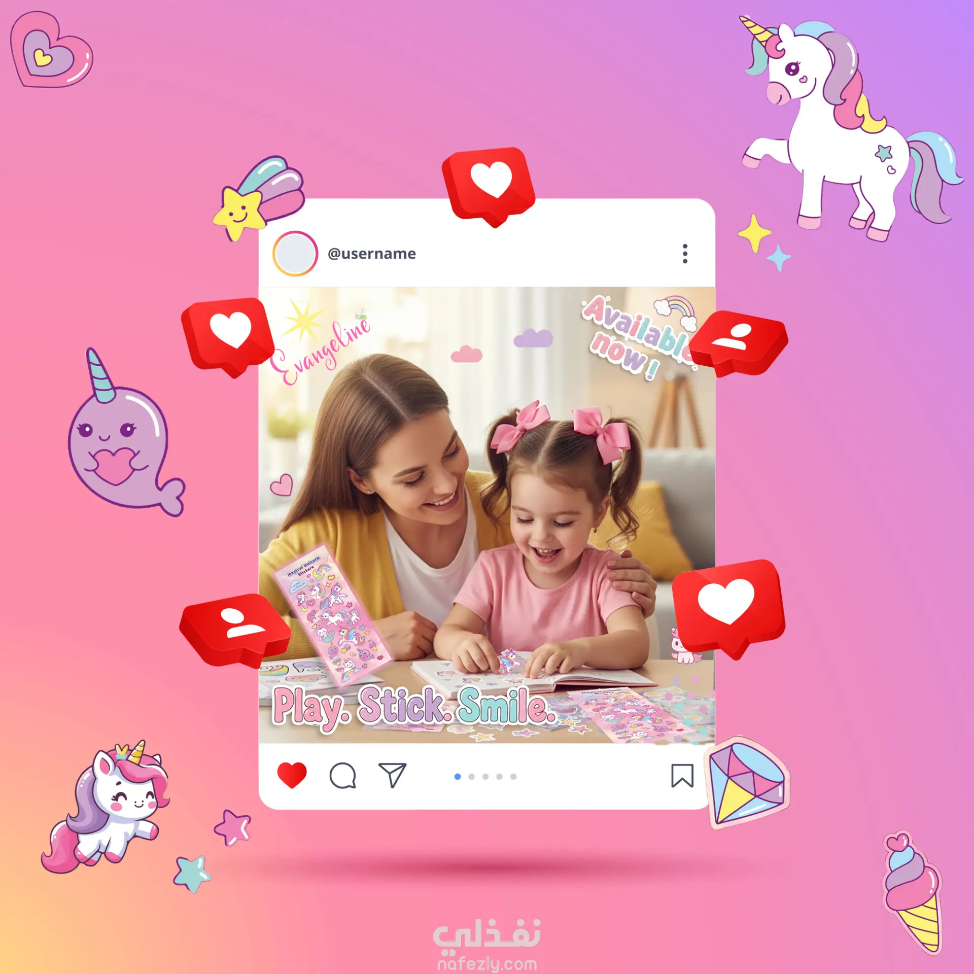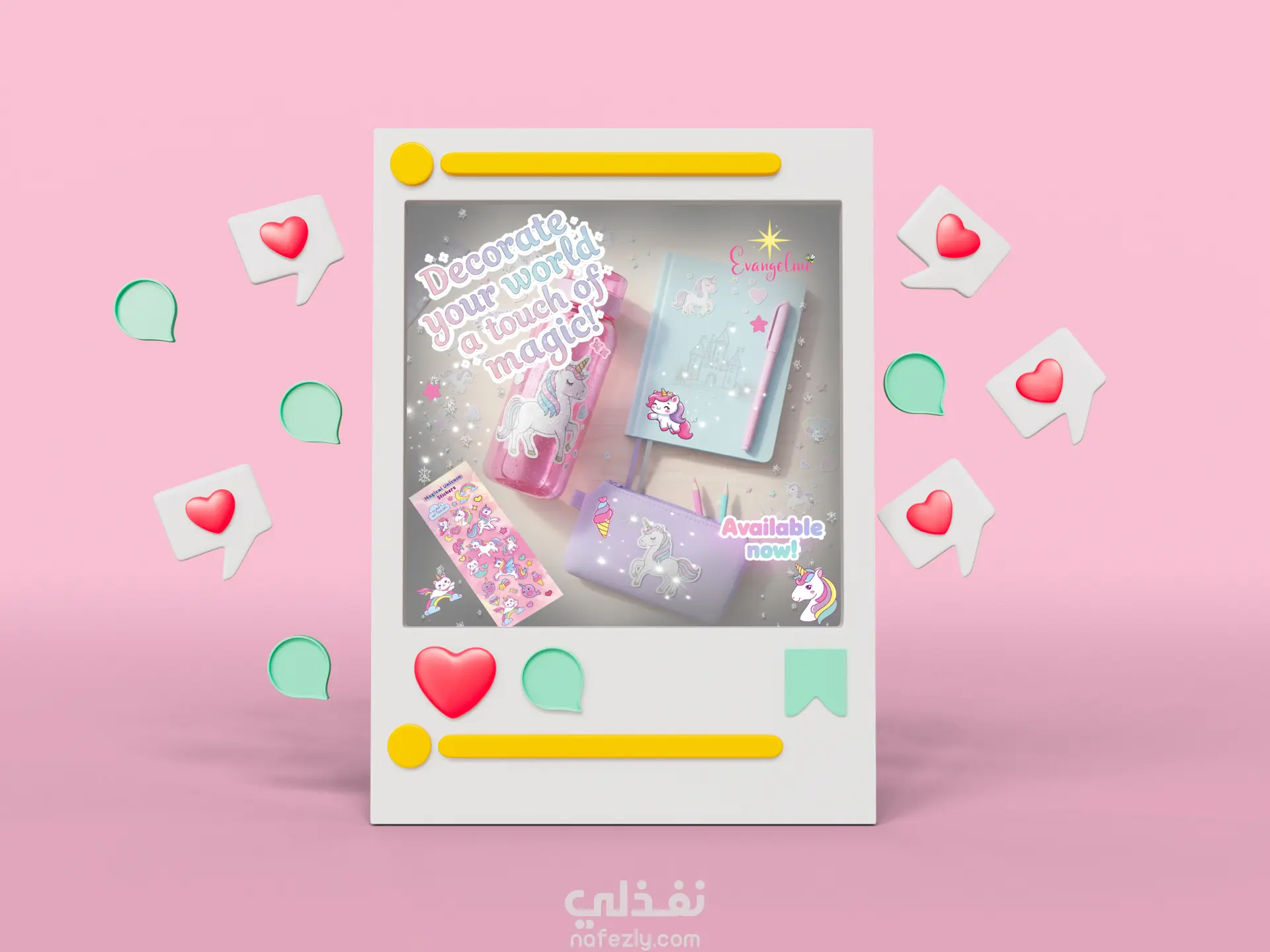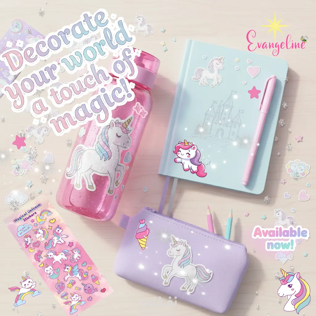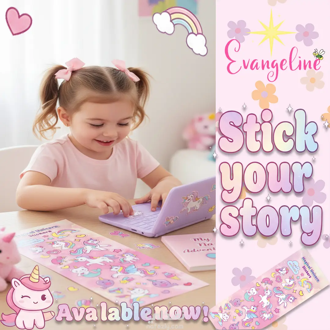 "لأن التفاصيل الصغيرة هي التي تصنع أجمل الذكريات.. صممتُ هذه المجموعة من ملصقات اليونيكورن لتكون رفيقة طفلتكِ في رحلة الإبداع. ألوان مبهجة، رسومات لطيفة، وجودة تجعل كل ركن في غرفتها أو أدواتها المدرسية يتحدث بالجمال. 🦄💖"