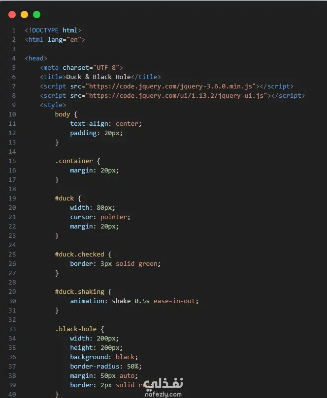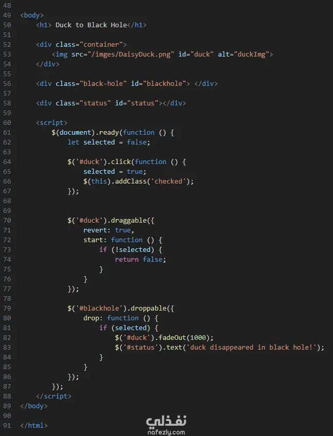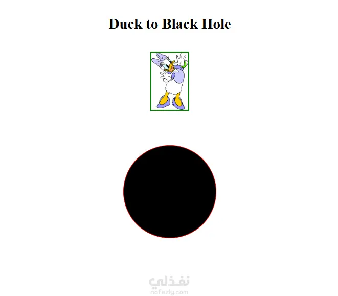 تطبيق ويب تفاعلي يستخدم خاصية السحب والإفلات (Drag & Drop) من jQuery UI. الهدف هو سحب صورة البطة إلى الثقب الأسود، مما يؤدي إلى اختفائها مع عرض رسالة تفاعلية. المميزات: سحب وإفلات بخصائص jQuery UI رسائل تفاعلية عند الإفلات تأثيرات بصرية (اهتزاز، اختفاء) واجهة بسيطة وتعليمية التقنيات المستخدمة: jQuery jQuery UI HTML, CSS
