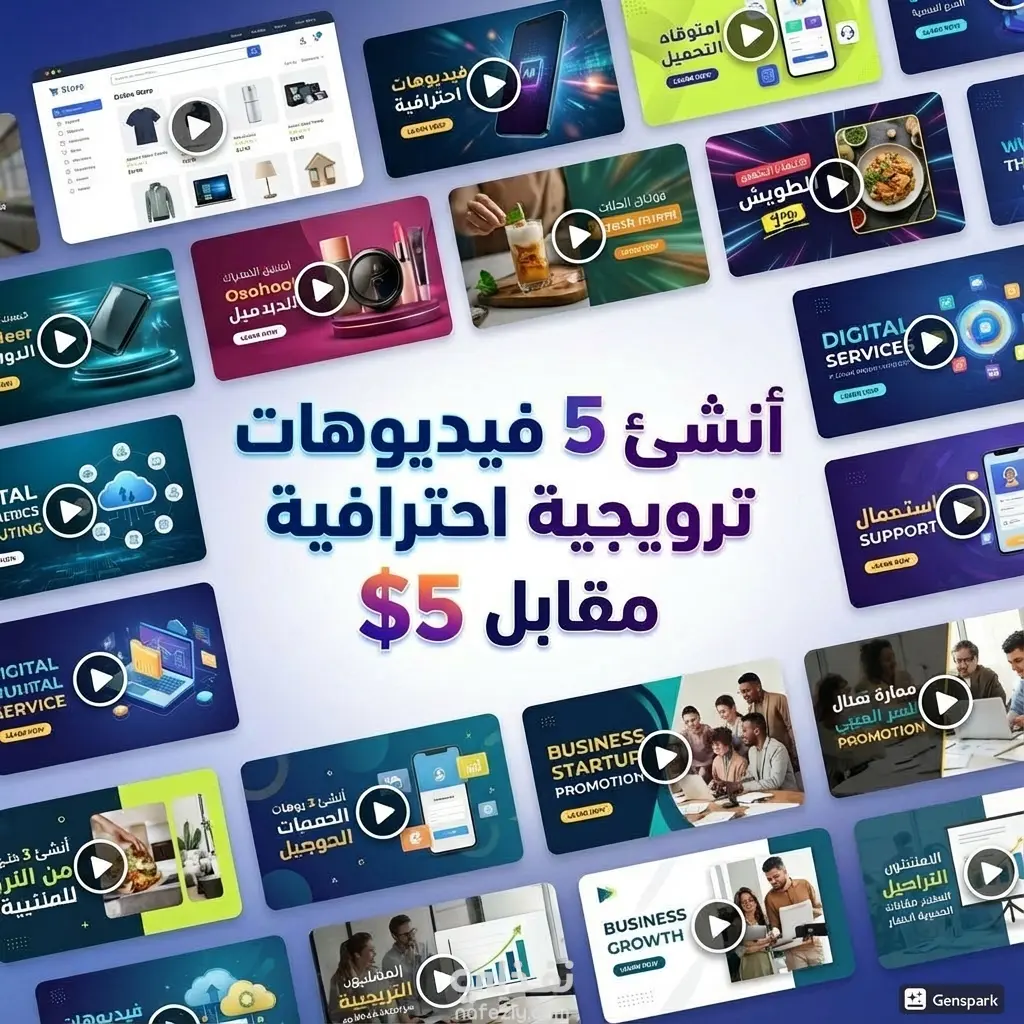 تُظهر الصورة تصميماً إعلانياً جذاباً لخدمة صناعة المحتوى المرئي، حيث يعتمد على عرض شبكي (Grid) لمجموعة متنوعة من النماذج الحية للفيديوهات. تتوسط التصميم عبارة تسويقية قوية باللغة العربية: "أنشئ 5 فيديوهات ترويجية احترافية مقابل 5$"، مع استخدام تدرج لوني عصري يجمع بين البنفسجي والبرتقالي لجذب الانتباه.
