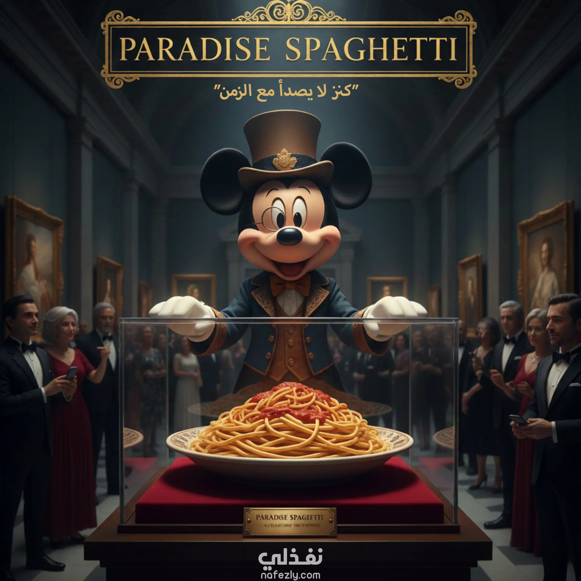 بوستر اعلان لوجو المطعم ( ميكي ماوس ) يقدم طبق مكرونة في مطعم حيث تبدو و كأنها قطعة اثرية فريدة