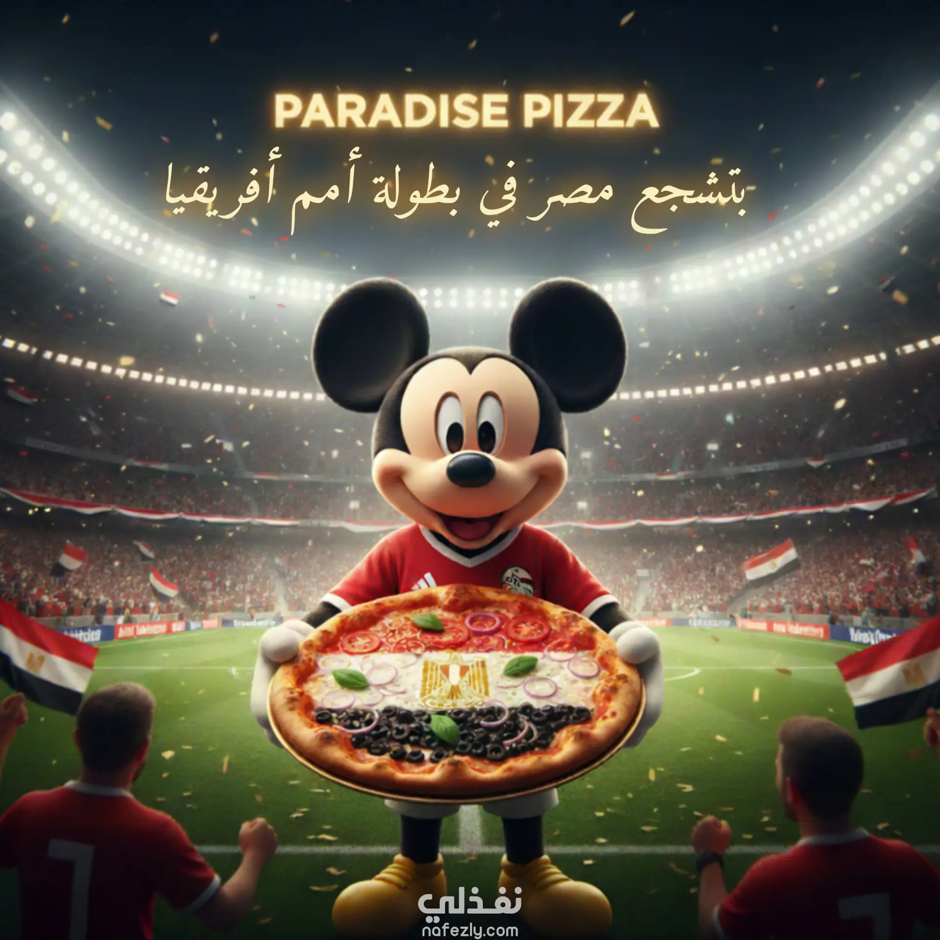 اعلان مطعم بيتزا حيث لوجو المطلعم ( ميكي ماوس ) برتدي تيشيرت منتخب مصر و الصورة تركز علي دعم وتشجيع المطعم للمنتخب المصري فيبطولة الامم الافريقية