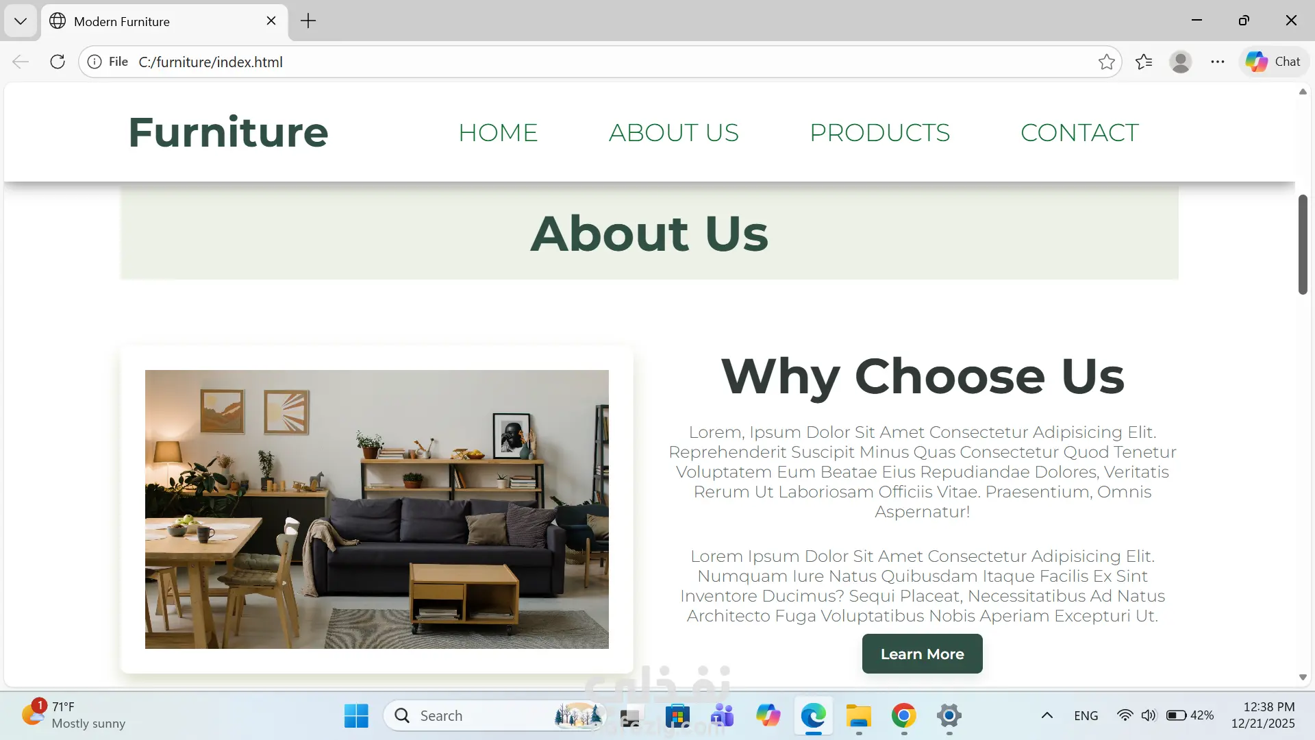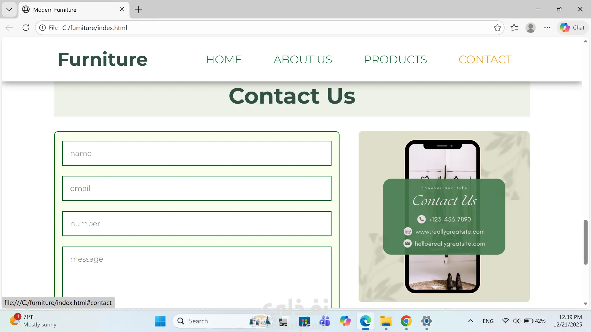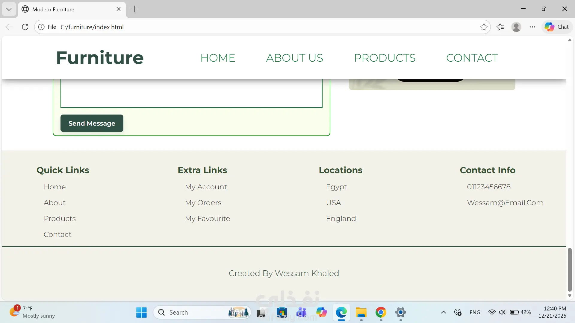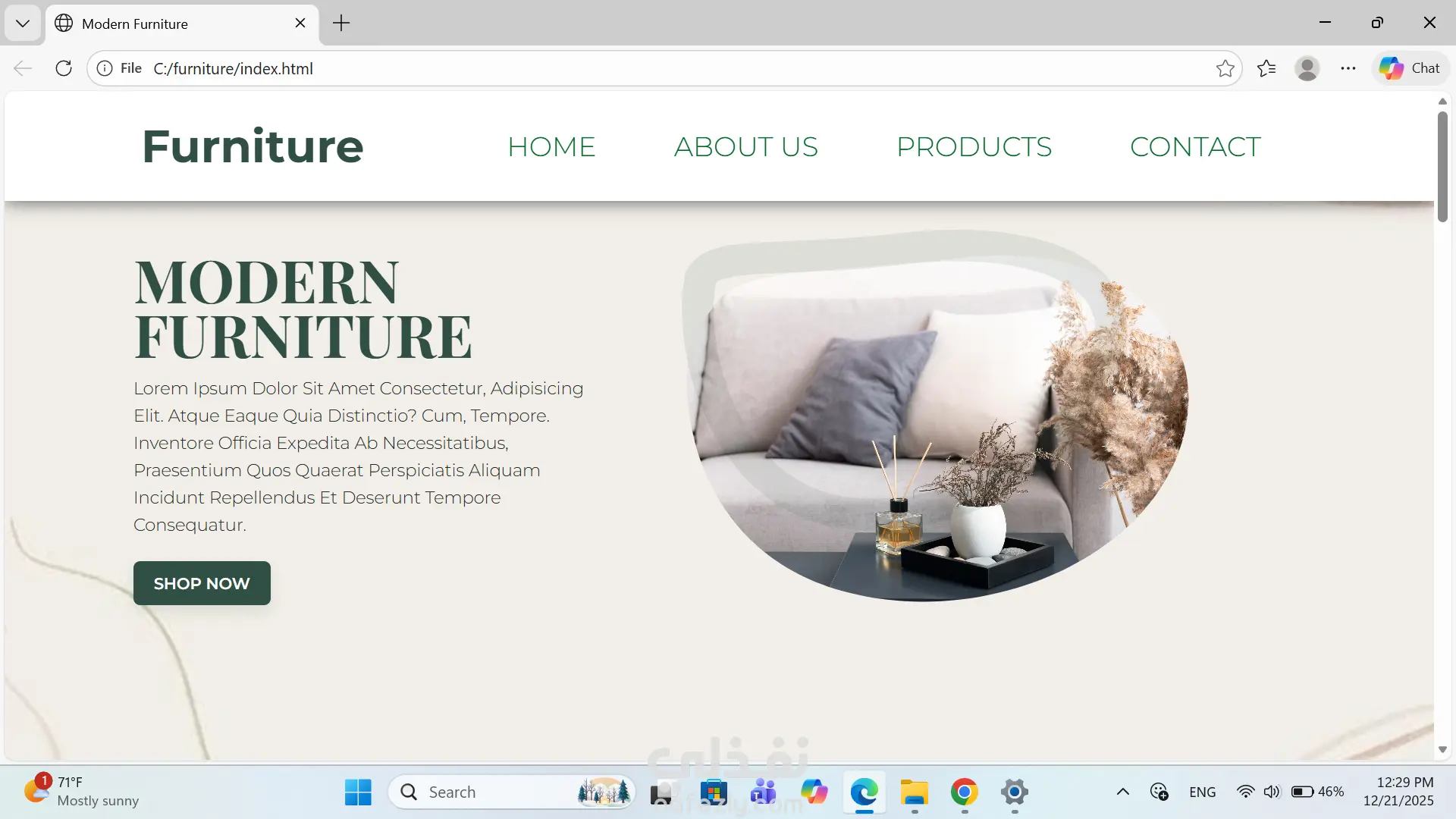تصميم وتطوير موقع أثاث (Furniture Website) باستخدام HTML5 و CSS3 فقط، مع الاهتمام بالتصميم العصري وتجربة المستخدم. الموقع مخصص لعرض منتجات الأثاث بشكل أنيق ومنظم، ويصلح كواجهة تعريفية لمعرض أثاث أو مشروع تجاري، مع دعم كامل لجميع أحجام الشاشات (Responsive Design). ✨ مميزات الموقع تصميم بسيط وعصري مناسب لمجال الأثاث متوافق مع جميع الشاشات (Desktop – Tablet – Mobile) تنظيم احترافي لعرض المنتجات والأقسام استخدام Flexbox و CSS Grid في بناء التخطيط كود منظم وسهل التعديل والتطوير سرعة تحميل عالية بدون استخدام JavaScript 🛠️ التقنيات المستخدمة HTML5 CSS3 Flexbox CSS Grid Media Queries