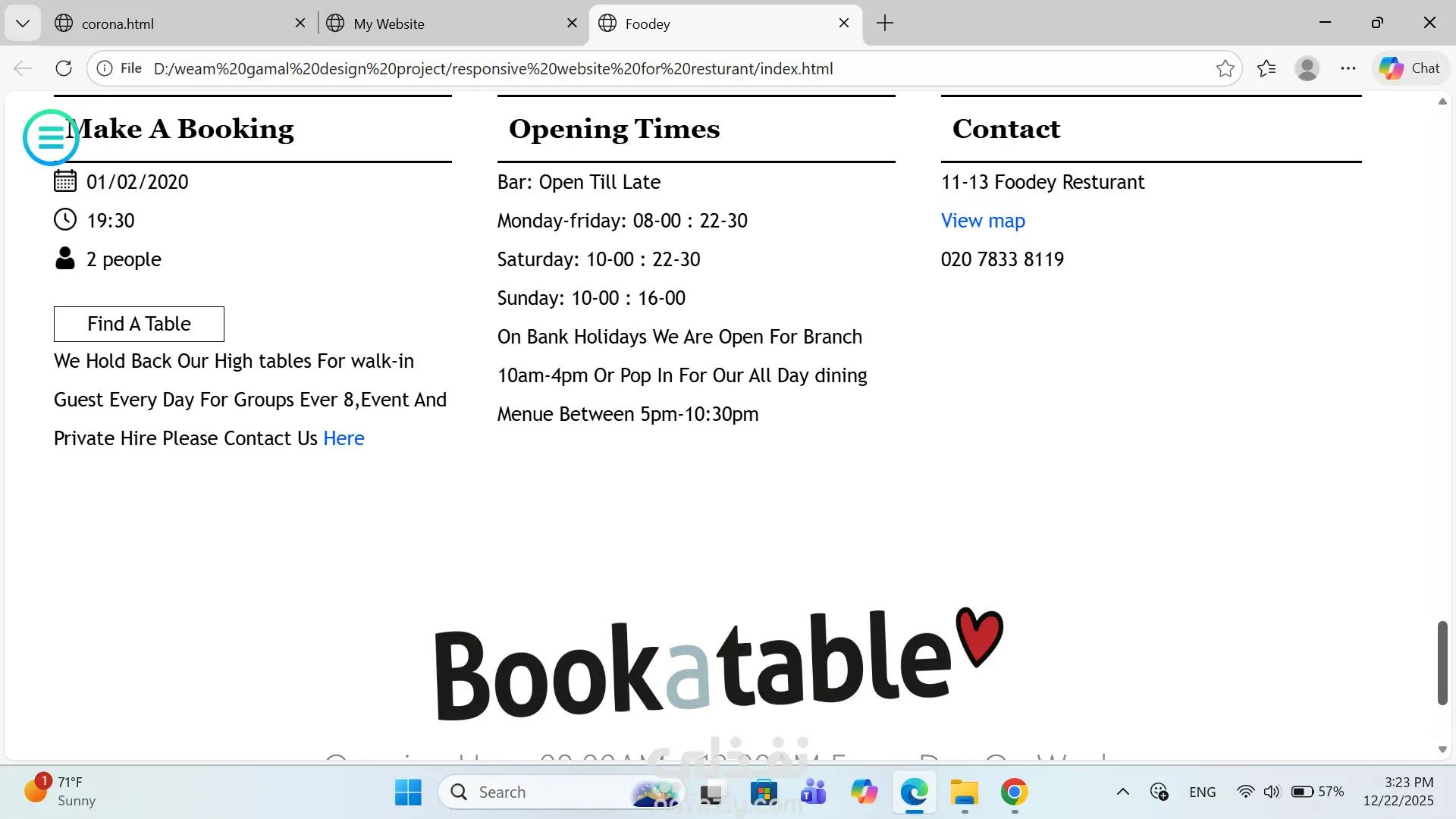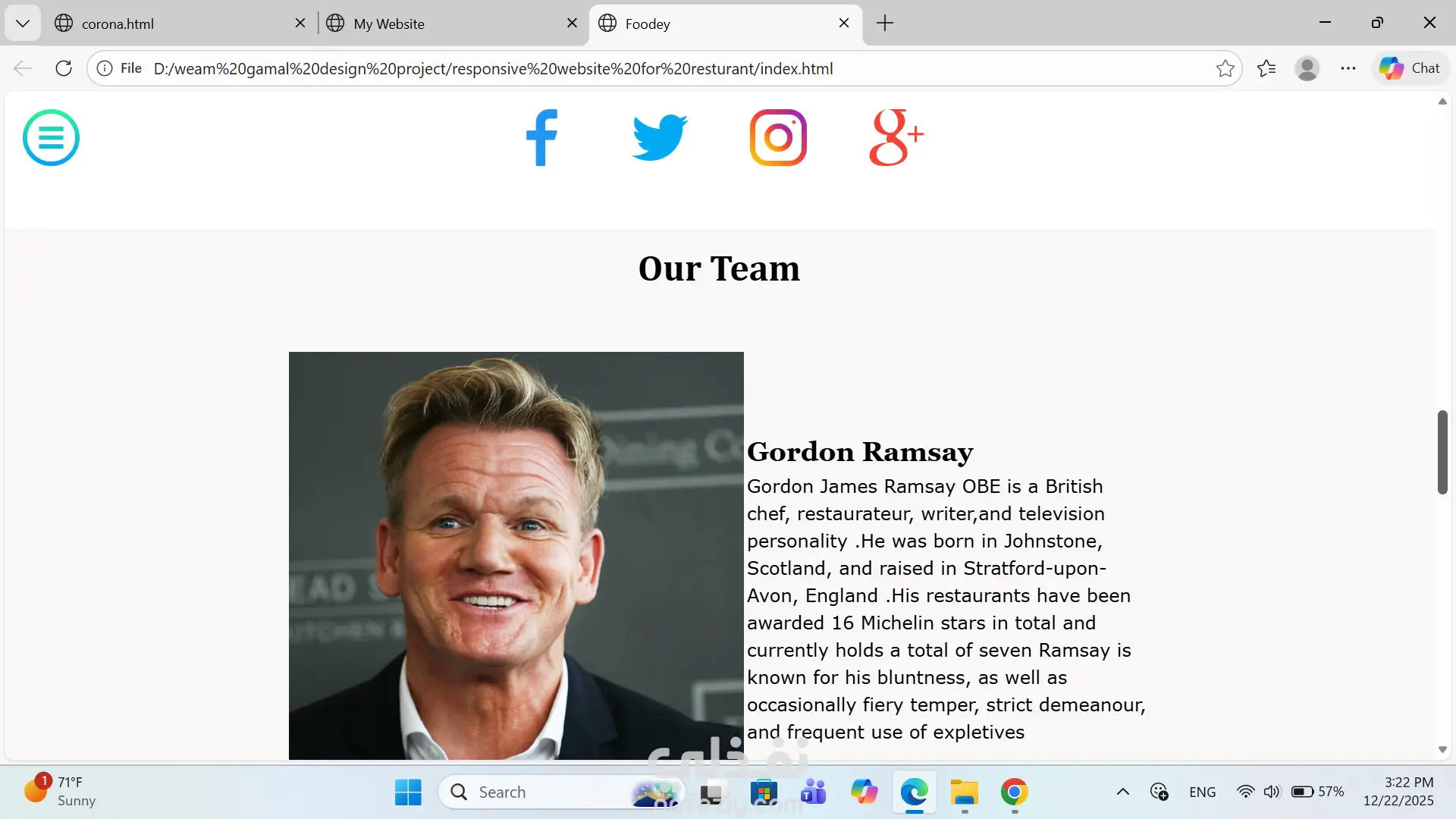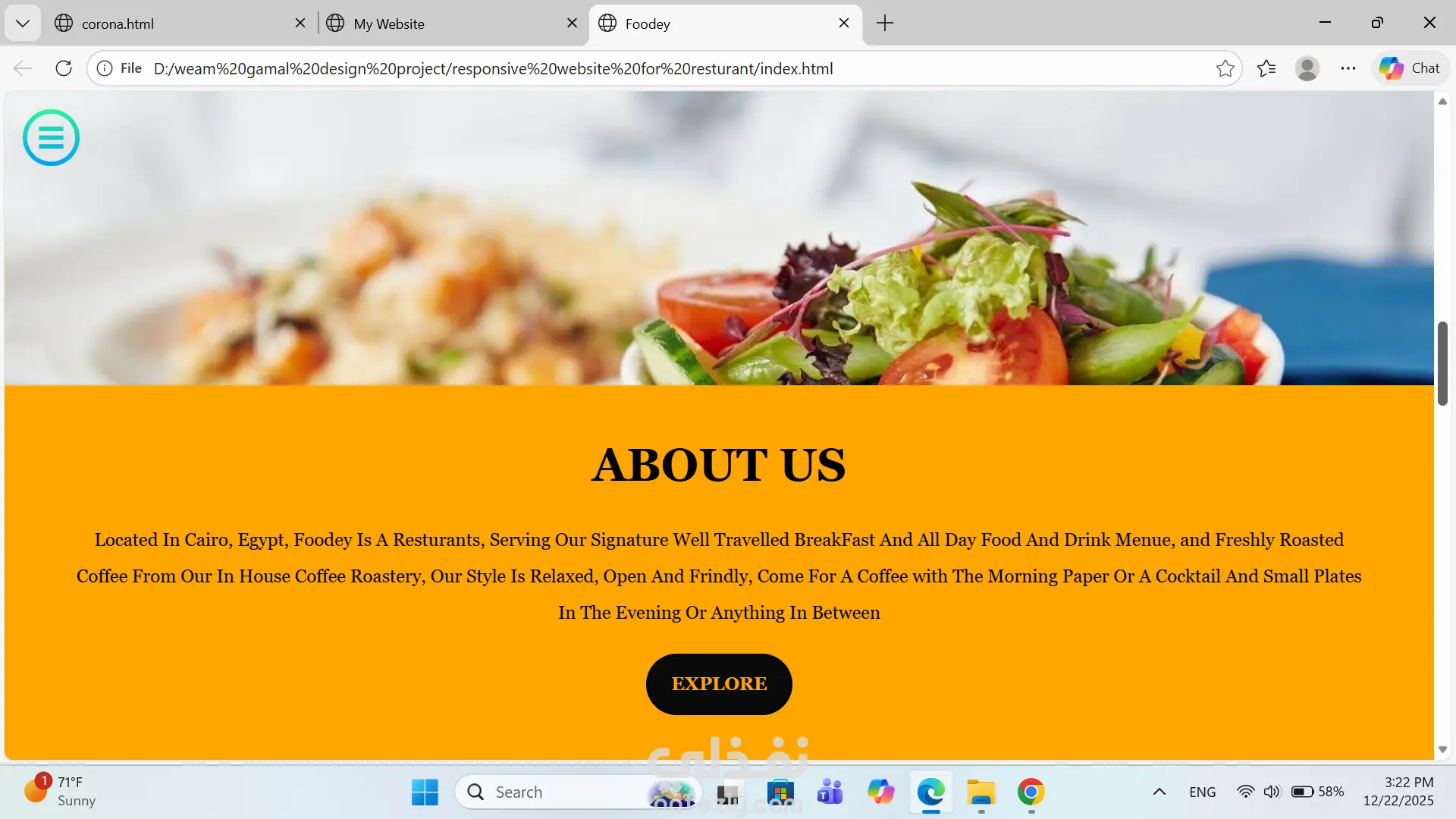 تصميم وتطوير موقع Foody للطعام باستخدام HTML5 و CSS3 و JavaScript، يهدف إلى عرض المحتوى الغذائي بطريقة جذابة وسهلة الاستخدام، مع التركيز على تجربة المستخدم وسلاسة التصفح. الموقع يقدم واجهة تفاعلية لعرض الأكلات، الأقسام، أو الوصفات، مع تصميم عصري ومتجاوب يعمل بكفاءة على جميع أحجام الشاشات (Responsive Design). ✨ مميزات الموقع تصميم عصري وبسيط مناسب لمجال الطعام واجهة مستخدم سهلة وواضحة تفاعل ديناميكي باستخدام JavaScript تنظيم المحتوى في أقسام واضحة متوافق مع جميع الشاشات (كمبيوتر – تابلت – موبايل) كود منظم وسهل التعديل والتطوير سرعة تحميل جيدة بدون الاعتماد على مكتبات خارجية 🛠️ التقنيات المستخدمة HTML5 CSS3 JavaScript Flexbox Media Queries