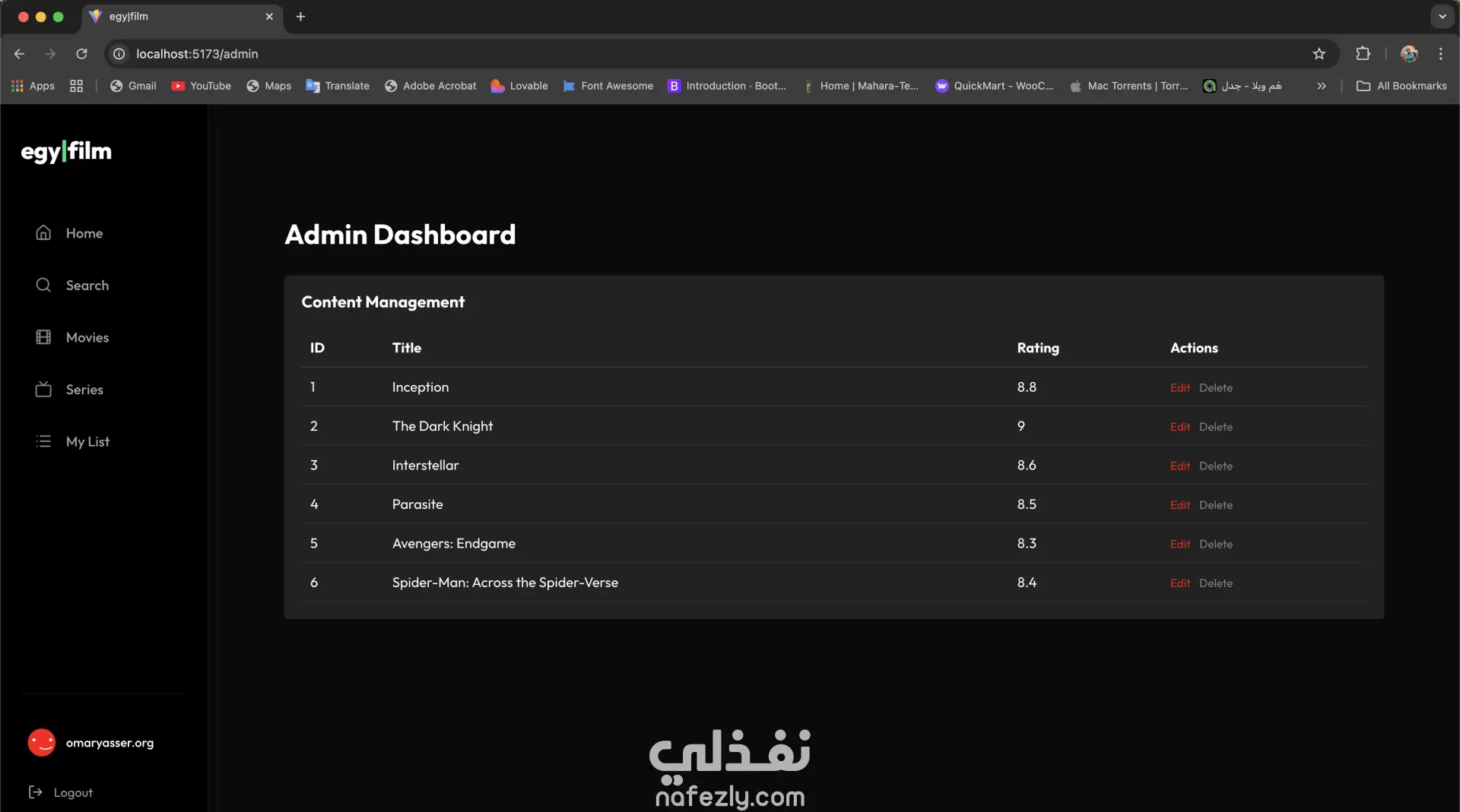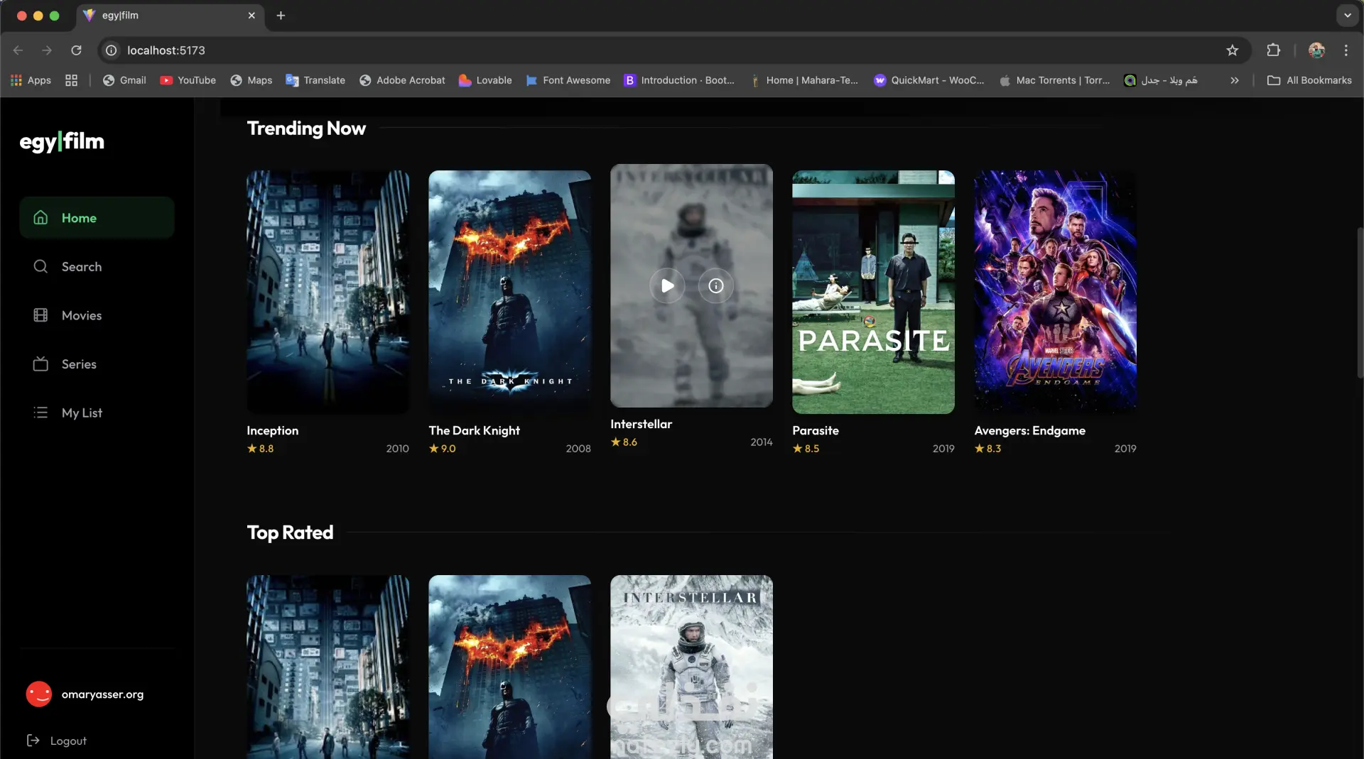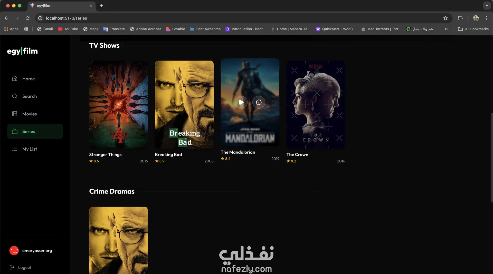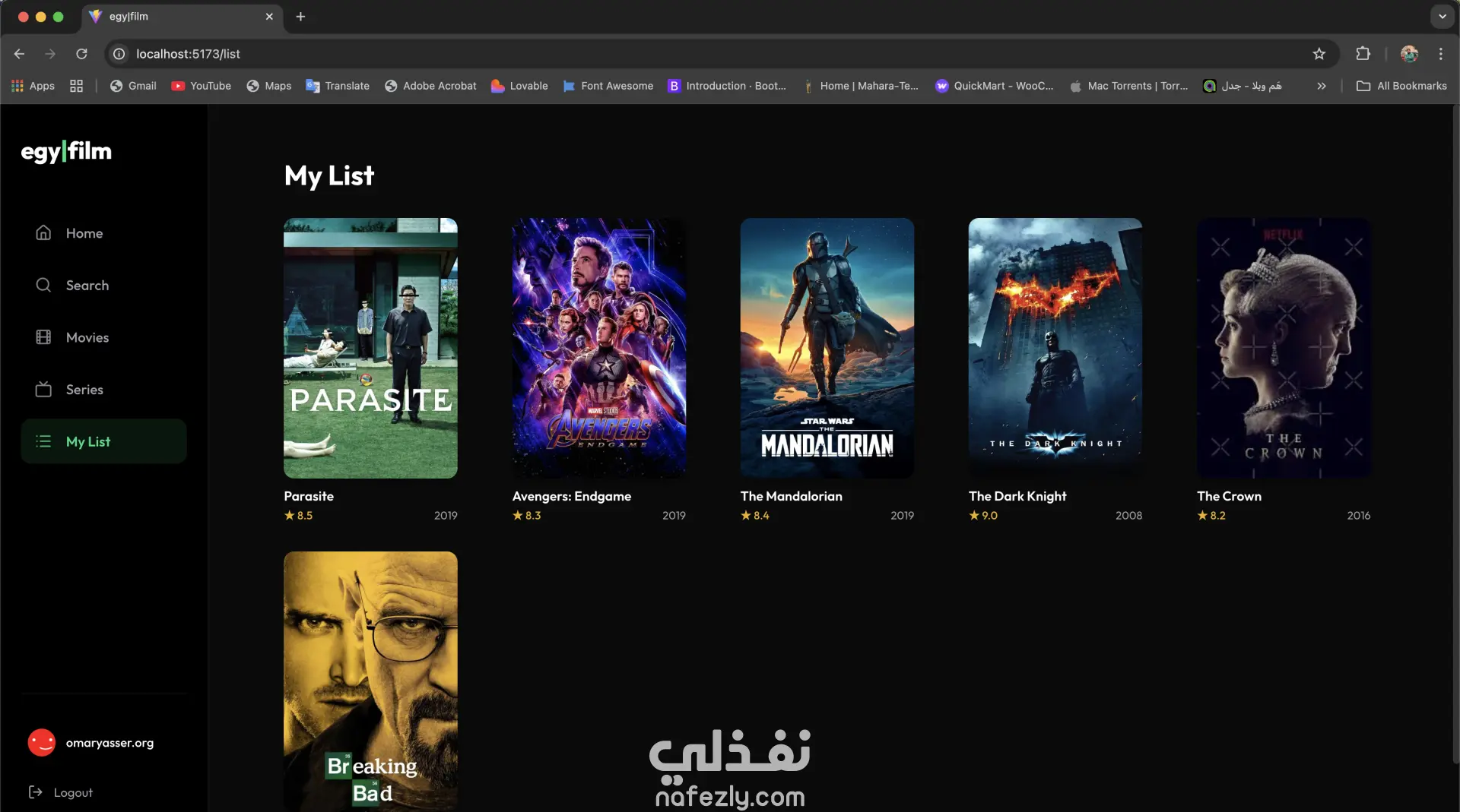 قمت بتصميم وتطوير منصة ويب لعرض الأفلام والمسلسلات باسم egy|film باستخدام React + Vite، مع التركيز على تجربة مستخدم حديثة وتصميم احترافي مناسب للاستخدام الفعلي والبورتفوليو. المنصة تتيح للمستخدم تصفح الأفلام والمسلسلات، البحث عنها، إضافتها لقائمة المفضلة، واختيار بروفايلات مستخدمين مختلفة، مع واجهة متجاوبة تعمل بكفاءة على جميع الشاشات. أهم مميزات المشروع: عرض الأفلام والمسلسلات مقسمة حسب التصنيفات صفحة Movies وصفحة Series مع فلترة ذكية محرك بحث شغال فعليًا بالاسم والتصنيف Watchlist (قائمة مفضلة) محفوظة محليًا نظام Profiles (بما فيهم Kids) خلفية ديناميكية تتغير حسب الفيلم المختار تصميم حديث (Dark Mode) ومتناسق Responsive Design (موبايل – تابلت – ديسكتوب) Frontend Architecture منظمة وقابلة للتطوير المشروع مناسب كنموذج لمنصات: عرض المحتوى المنصات الترفيهية المعارض الرقمية تطبيقات React الحديثة