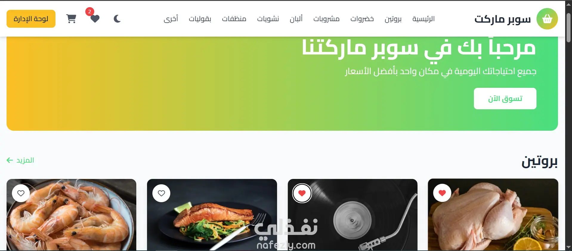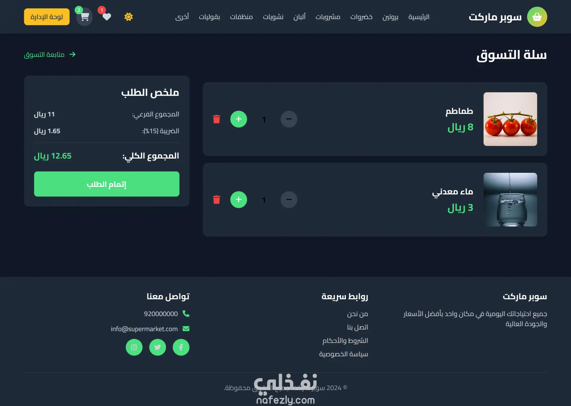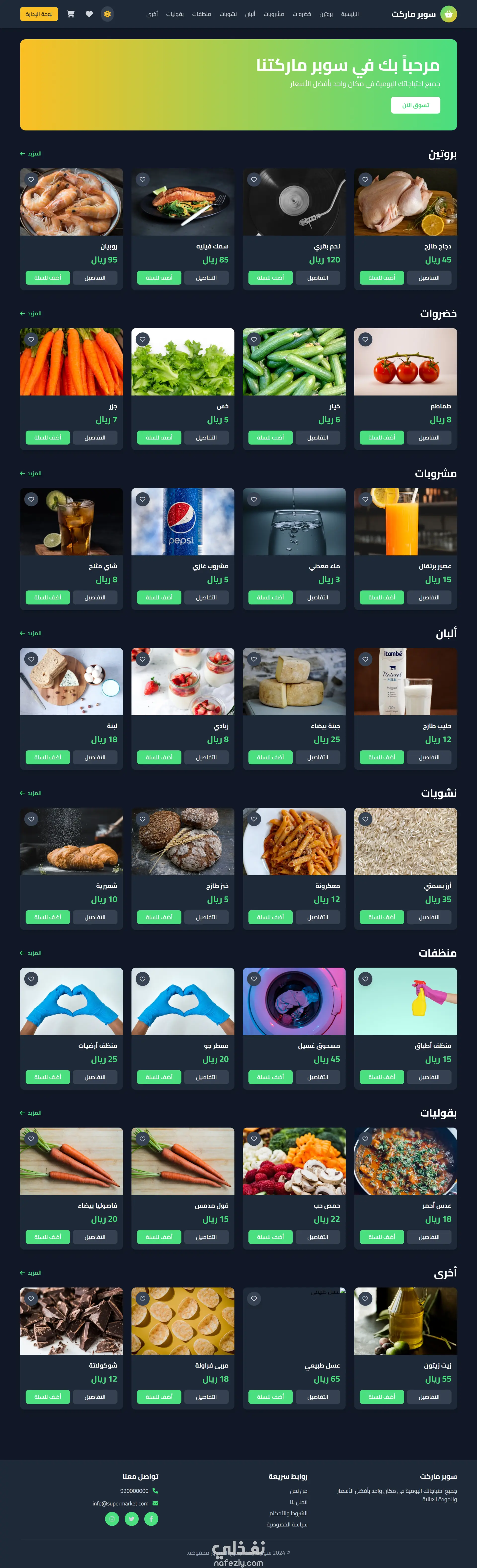 موقع سوبر ماركت تفاعلي ومتجاوب بالكامل. طوّرنا موقع تجارة إلكترونية متكامل الميزات، يتيح للمستخدمين التسجيل، وتصفح المنتجات، وإدارة سلة التسوق مع إمكانية الإضافة والحذف. صُمم الموقع لتحقيق الأداء الأمثل على جميع الأجهزة باستخدام مبادئ تصميم الويب المتجاوب. يهدف إلى خلق تجربة مستخدم سلسة وديناميكية. يركز المشروع على واجهة مستخدم أنيقة، ومكونات قابلة لإعادة الاستخدام، وتحديثات فورية لسلة التسوق لمحاكاة تجربة تسوق واقعية. طبّقنا خاصية التحميل البطيء للصور والمكونات لتحسين سرعة الصفحة وتقليل وقت التحميل الأولي. بُني باستخدام HTML، وCSS، وBootstrap، وJavaScrip.