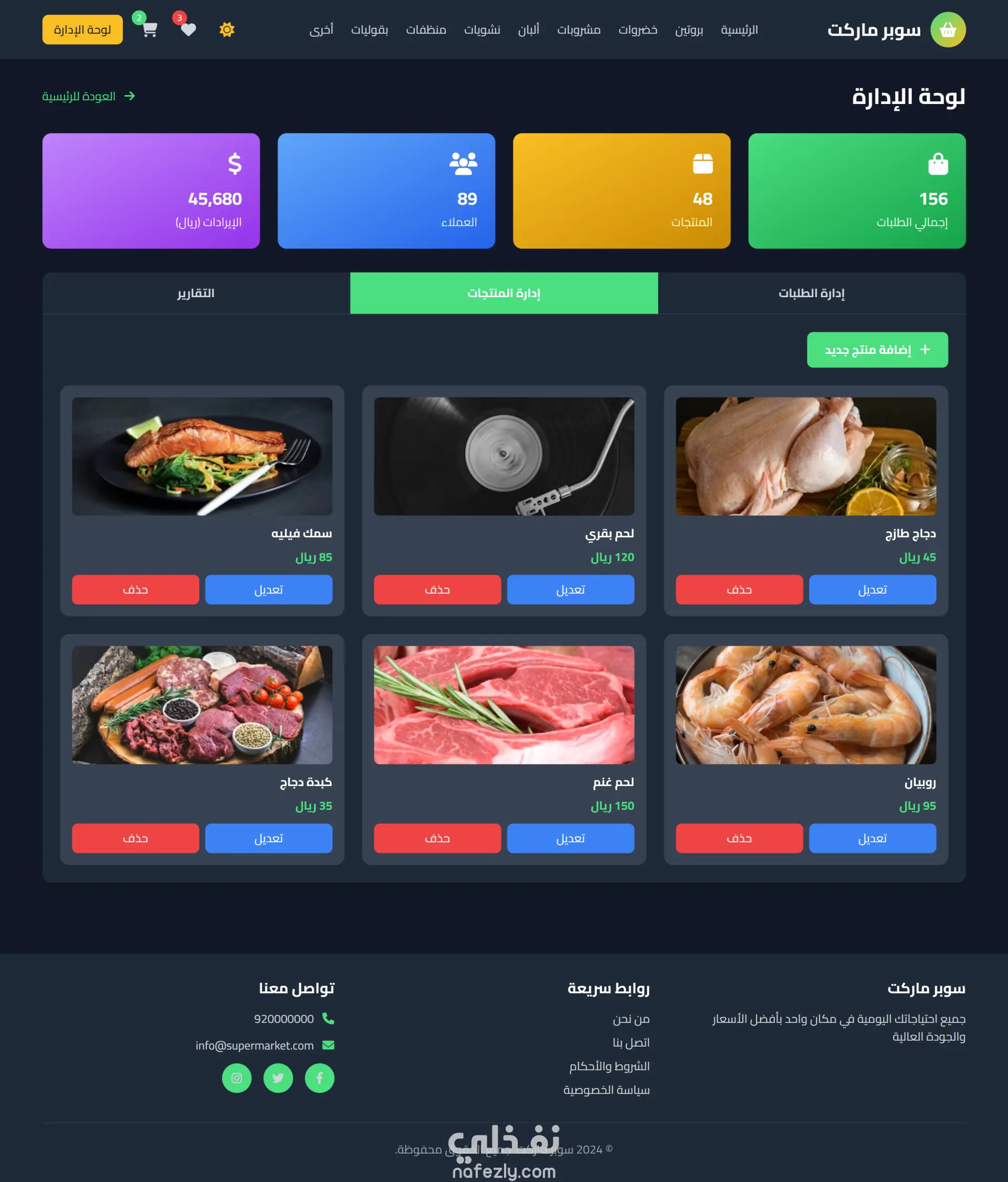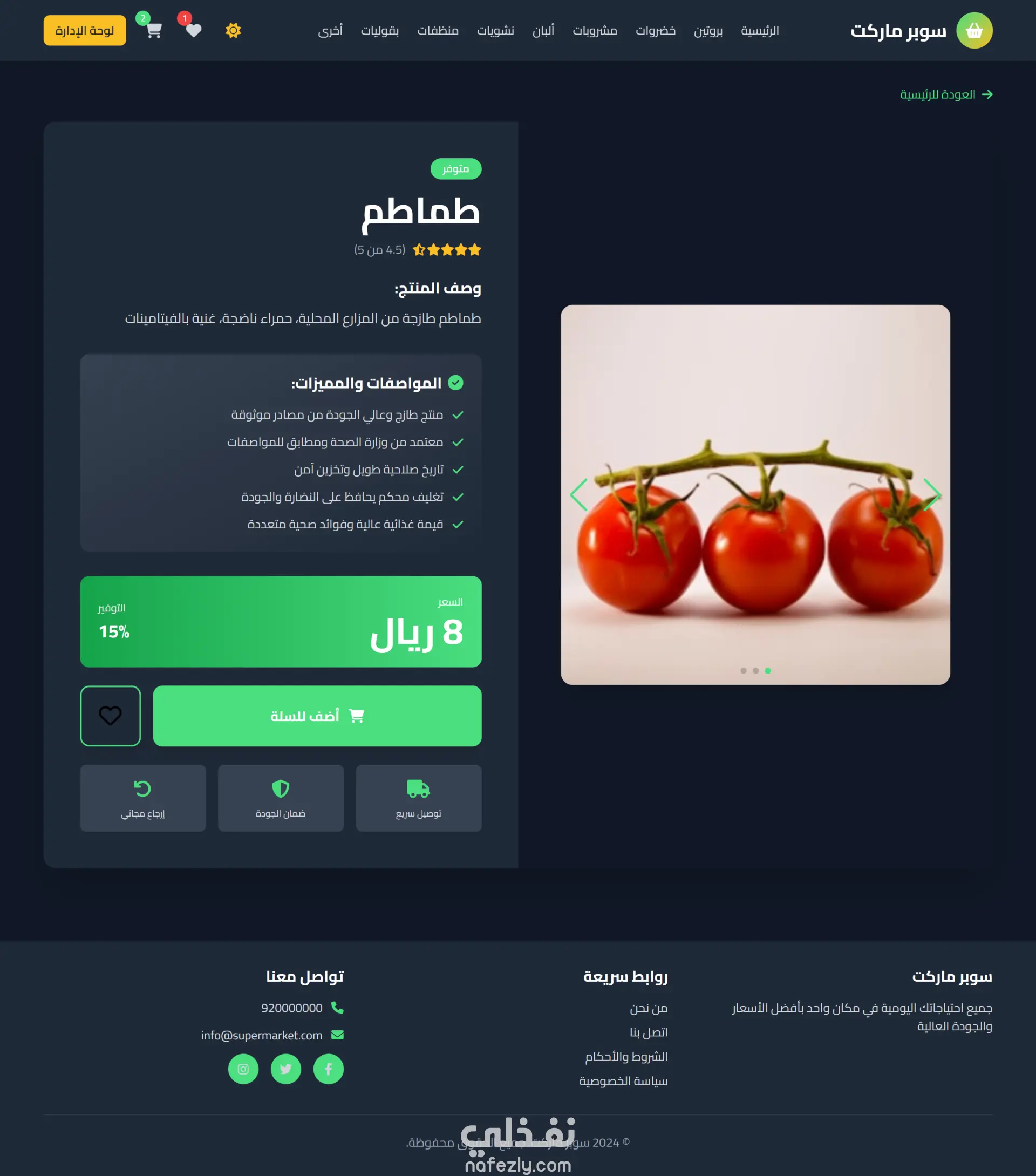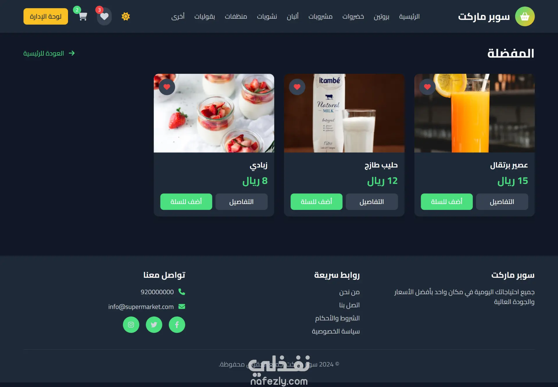 موقع سوبر ماركت تفاعلي ومتجاوب بالكامل. طوّرنا موقع تجارة إلكترونية متكامل الميزات، يتيح للمستخدمين التسجيل، وتصفح المنتجات، وإدارة سلة التسوق مع إمكانية الإضافة والحذف. صُمم الموقع لتحقيق الأداء الأمثل على جميع الأجهزة باستخدام مبادئ تصميم الويب المتجاوب. يهدف إلى خلق تجربة مستخدم سلسة وديناميكية. يركز المشروع على واجهة مستخدم أنيقة، ومكونات قابلة لإعادة الاستخدام، وتحديثات فورية لسلة التسوق لمحاكاة تجربة تسوق واقعية. طبّقنا خاصية التحميل البطيء للصور والمكونات لتحسين سرعة الصفحة وتقليل وقت التحميل الأولي. بُني باستخدام HTML، وCSS، وBootstrap، وJavaScrip.