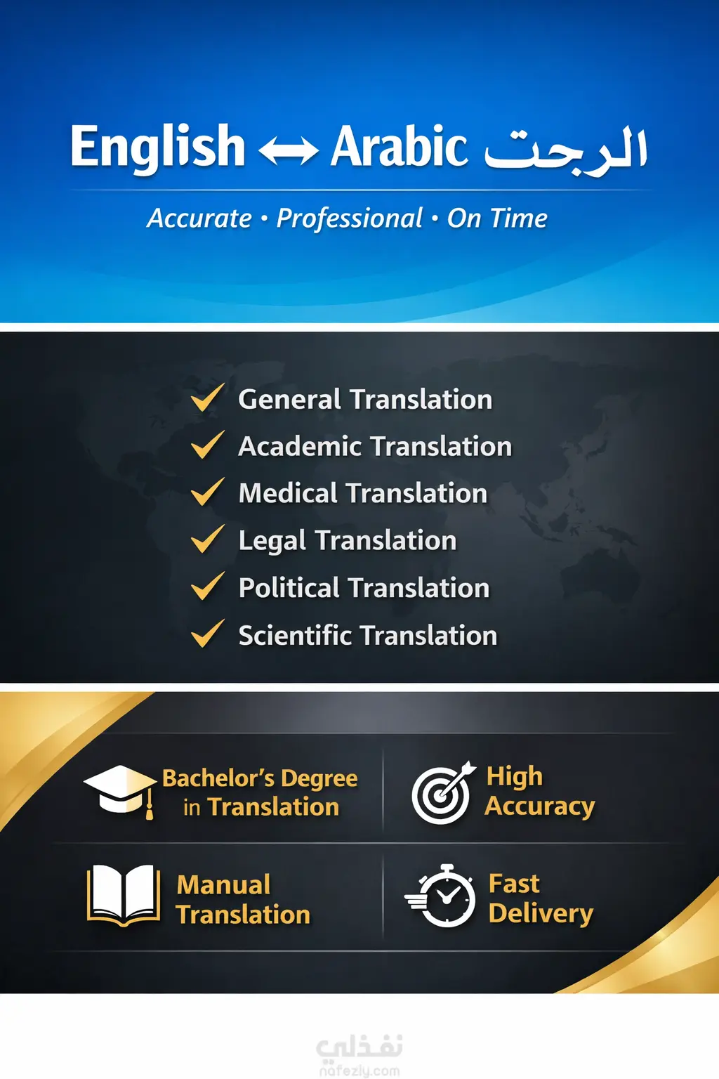 I am an English–Arabic translator with a Bachelor’s degree in Translation, graduated with a Very Good grade. I have a good understanding of different translation fields and the ability to adapt my work to the purpose and context of each text. I provide accurate and clear translations in several areas, including general, academic, medical, legal, political, and scientific translation. I focus on delivering translations that preserve the original meaning, tone, and intent of the source text. I am committed to meeting deadlines and reviewing my work carefully before delivery to ensure high quality. Clear communication and client satisfaction are always a priority for me.