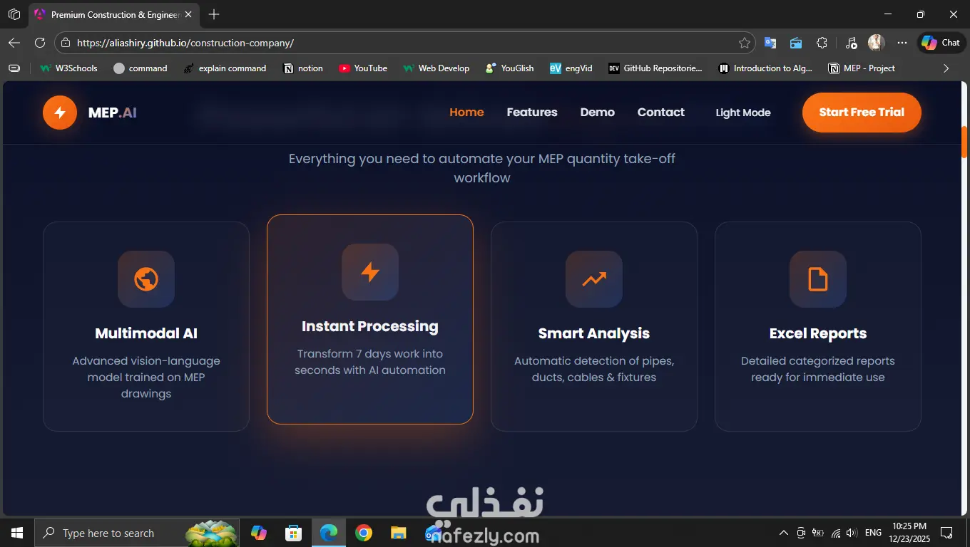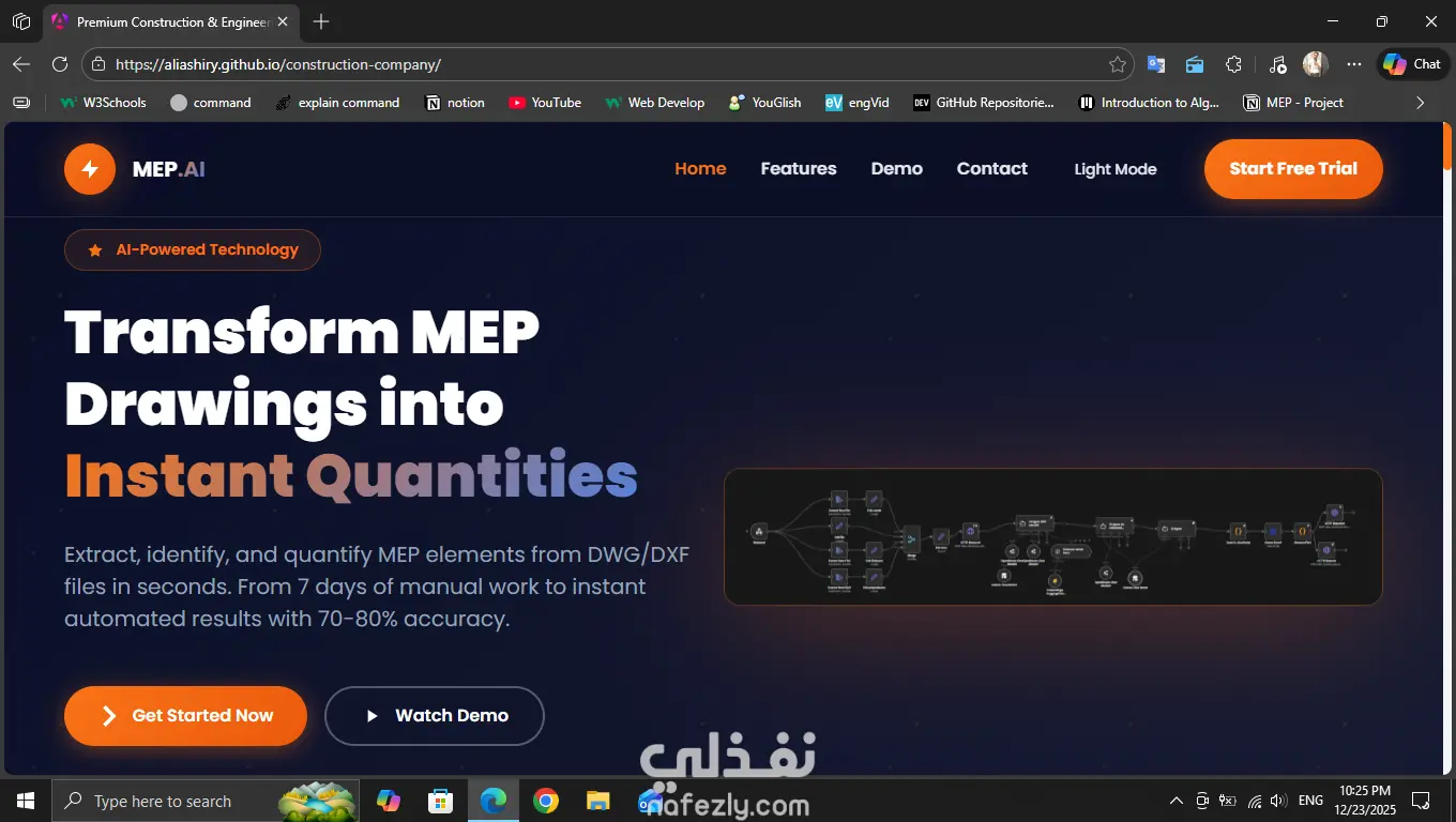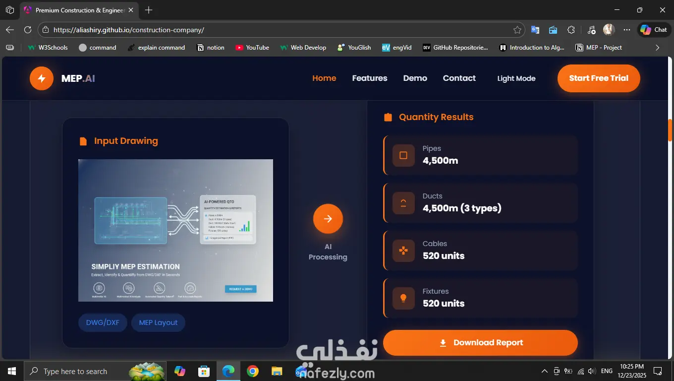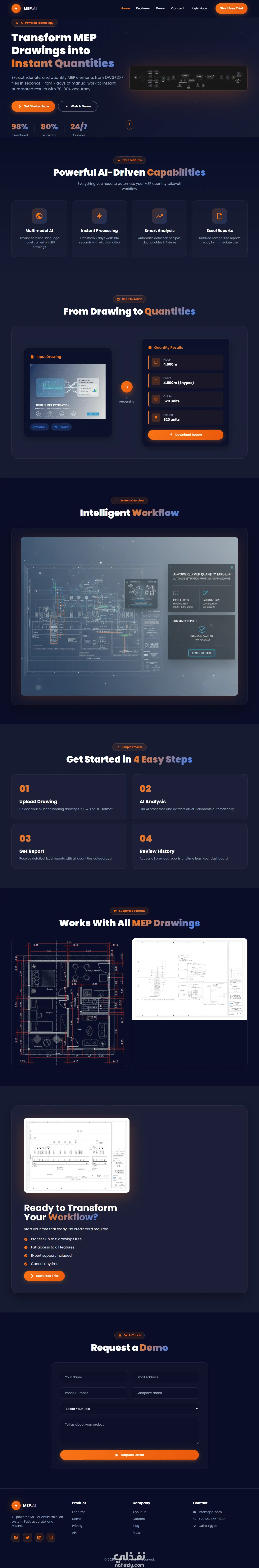 المشروع يقدم حلًا عمليًا على شكل موقع ويب لمشروعات الإنشاءات الكهربائية والميكانيكية والصحية (MEP)، مع التركيز على أتمتة حساب كميات المواد وتقدير احتياجات الموقع. يتيح النظام للمهندسين رفع ملفات المشروع، ومعالجة البيانات وتحليلها، وعرض النتائج بشكل واضح مع متابعة تاريخ المشروع عبر واجهة سهلة الاستخدام. يساهم الحل في تقليل الجهد اليدوي، وتقليل الأخطاء البشرية، وتوفير الوقت من خلال تقديم بيانات دقيقة عن المواد، كما يتميز بهندسة برمجية قابلة للتوسع والصيانة لتلبية احتياجات بيئة العمل الواقعية في مجالات الإنشاءات والهندسة. المشروع نُفذ ضمن تجربة عملية مكثفة لمدة 6 أشهر في ITI، حيث انتقل الفريق من التعلم النظري إلى بناء حلول برمجية حقيقية تحت ظروف وتحديات مشابهة لسوق العمل. الويب سايت يحتوي على عدة مميزات عملية، منها: حصر المواد المستخدمة في الموقع بدقة تسهيل عملية Quantity Take-Off للمواد تقديم واجهة تفاعلية سهلة الاستخدام مع دعم الوضعين الفاتح والداكن تعزيز تحليل البيانات ودعم اتخاذ القرار باستخدام نماذج ذكية تعتمد على الذكاء الاصطناعي كما تم تطوير المشروع باستخدام Angular للواجهة الأمامية، وASP.NET للواجهة الخلفية، مع RESTful APIs للتواصل بين الواجهة الأمامية والخلفية، وMS SQL Server لإدارة البيانات بشكل آمن وقابل للتوسع. بني النظام بهيكلية نظيفة وقابلة للصيانة والتطوير، لتكون جاهزة للتطبيق العملي في بيئات العمل الحقيقية. المشروع يعكس أيضًا تجربة تعاونية وفهمًا عمليًا لمهارات حل المشكلات والعمل الجماعي والمنهجية البرمجية، وهو أساس قوي لتقديم حلول متقدمة للمهندسين الميكانيكيين والكهربائيين في المستقبل.
