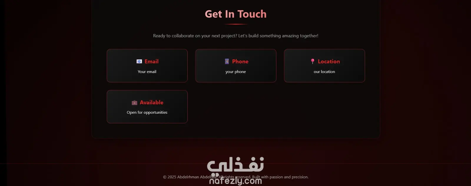 موقع بورتفوليو احترافي جاهز للاستخدام مباشرة! هل تبحث عن موقع شخصي يبرز مهاراتك ويجذب أصحاب العمل والعملاء؟ ما ستحصل عليه: المميزات التقنية: تصميم HTML5 & CSS3 نقي بدون أي مكتبات خارجية متجاوب 100% مع جميع الأجهزة (موبايل، تابلت، كمبيوتر) سرعة تحميل فائقة تأثيرات حركية احترافية (Animations) ألوان عصرية قابلة للتخصيص بسهولة الأقسام المتوفرة: صفحة رئيسية جذابة مع صورة شخصية قسم المهارات (Skills) بتصميم كروت تفاعلية قسم المشاريع (Projects) لعرض أعمالك قسم التواصل (Contact) بمعلومات الاتصال قائمة تنقل ثابتة (Sticky Navigation) التأثيرات البصرية: خلفية متحركة بتدرجات لونية تأثيرات توهج وإضاءة حركات سلسة عند التمرير (Scroll Animations) تأثيرات Hover إبداعية على جميع العناصر انتقالات ناعمة بين الأقسام سهولة التخصيص: كود نظيف ومنظم مع تعليقات واضحة إمكانية تغيير الألوان بسطر واحد استبدال المحتوى والصور بسهولة لا يحتاج خبرة برمجية متقدمة ما ستحصل عليه: ملف HTML كامل جاهز للرفع التصميم مجرب ومتوافق مع جميع المتصفحات دعم فني لمدة أسبوع شرح طريقة التعديل على البيانات مناسب لـ: المطورين والمبرمجين المصممين المستقلين (Freelancers) المسوقين الرقميين أي شخص يريد عرض أعماله بشكل احترافي ️ ملاحظة: الموقع جاهز للاستخدام فورًا، فقط استبدل المحتوى والصورة الشخصية ببياناتك! احصل على موقعك الآن وابدأ في جذب العملاء والفرص!