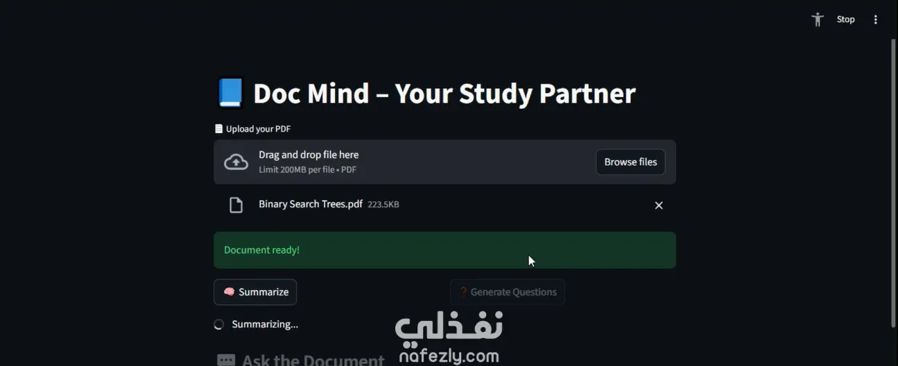نظام ذكاء اصطناعي للمستندات، يمكّن المستخدمين من التفاعل مع ملفات PDF عبر روبوت محادثة، مع توفير ملخص تلقائي للمستندات. تم بناء النظام باستخدام تقنية الاسترجاع المعزز بالجيل (RAG) لتقديم استجابات دقيقة وواعية بالسياق، مستندة إلى محتوى المستند.
