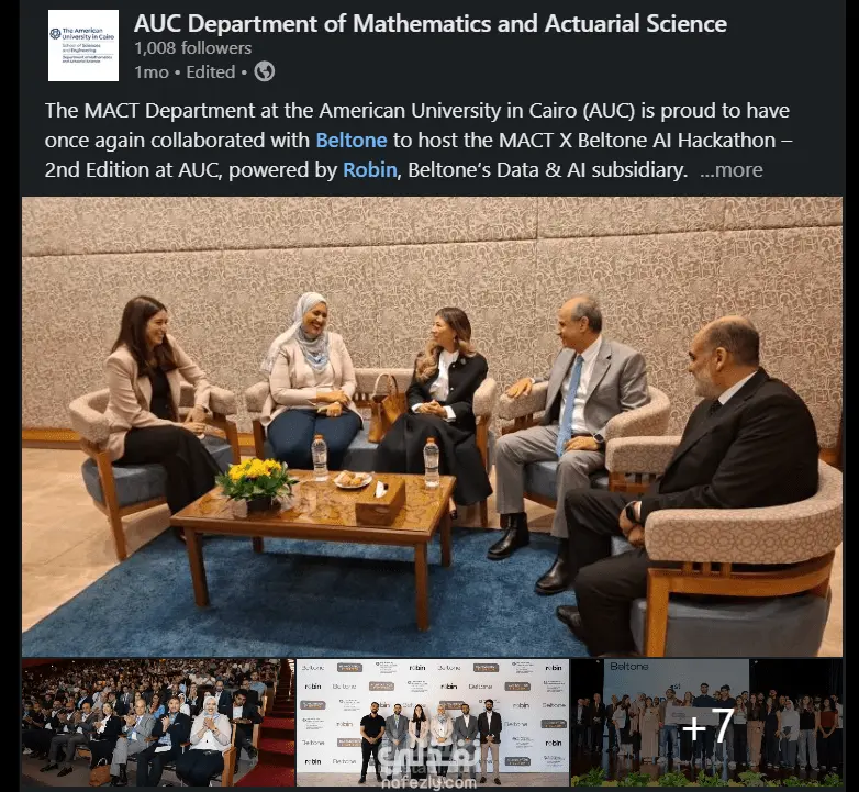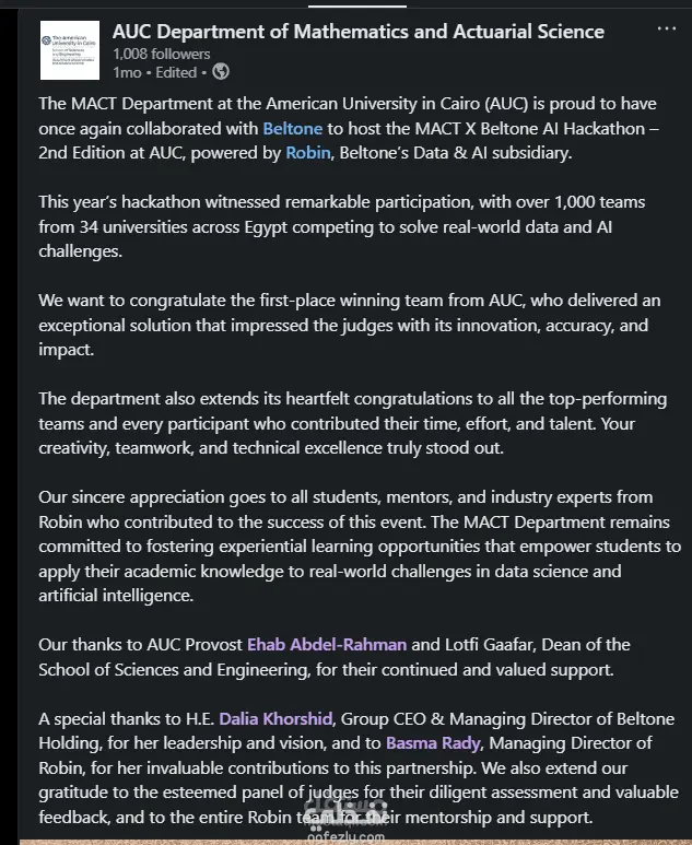 كتبت منشورًا رسميًا باللغة الإنجليزية لحساب قسم الرياضيات وعلوم الاكتواريا وعلوم البيانات (MACT) في الجامعة الأمريكية بالقاهرة على لينكدإن لتغطية فعالية MACT X Beltone AI Hackathon – 2nd Edition، بالشراكة مع Beltone، إحدى كبرى المؤسسات المالية والاستثمارية في مصر والمنطقة. تضمّن العمل: - صياغة ملخص احترافي للحدث (عدد الفرق، الجامعات، طبيعة التحديات). - توثيق مشاركة قيادات رفيعة المستوى، تضمنت نائب رئيس الجامعة وعميد كلية العلوم والهندسة و دكاترة جامعيين، إضافة إلى التأكيد على حضور ومساهمة السيدة داليا خورشيد، الرئيس التنفيذي لمجموعة بيلتون ووزيرة الاستثمار المصرية السابقة، بما يعكس أهمية الشراكة وقيمة الحدث لدى قطاع الاستثمار والتمويل. - شكر رسمي ومُنسَّق لشركاء الحدث من Beltone وRobin وهيئة التحكيم والخبراء الصناعيين، مع الحفاظ على أسلوب لغوي مناسب لعلامة جامعية وشريك مالي كبير. - الحفاظ على نبرة رسمية، واضحة، ومناسبة للنشر على لينكدإن.
